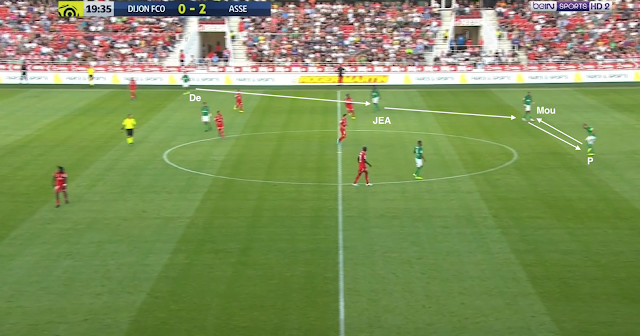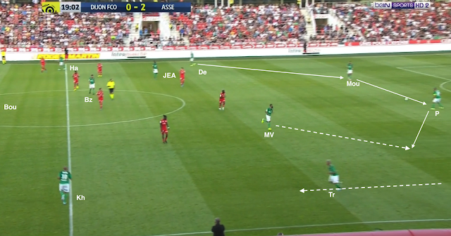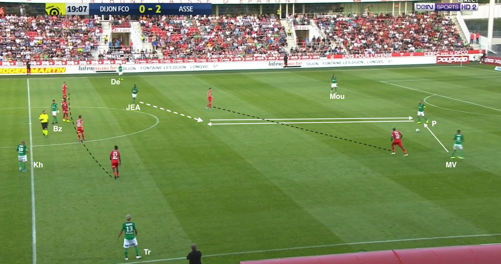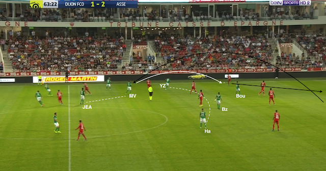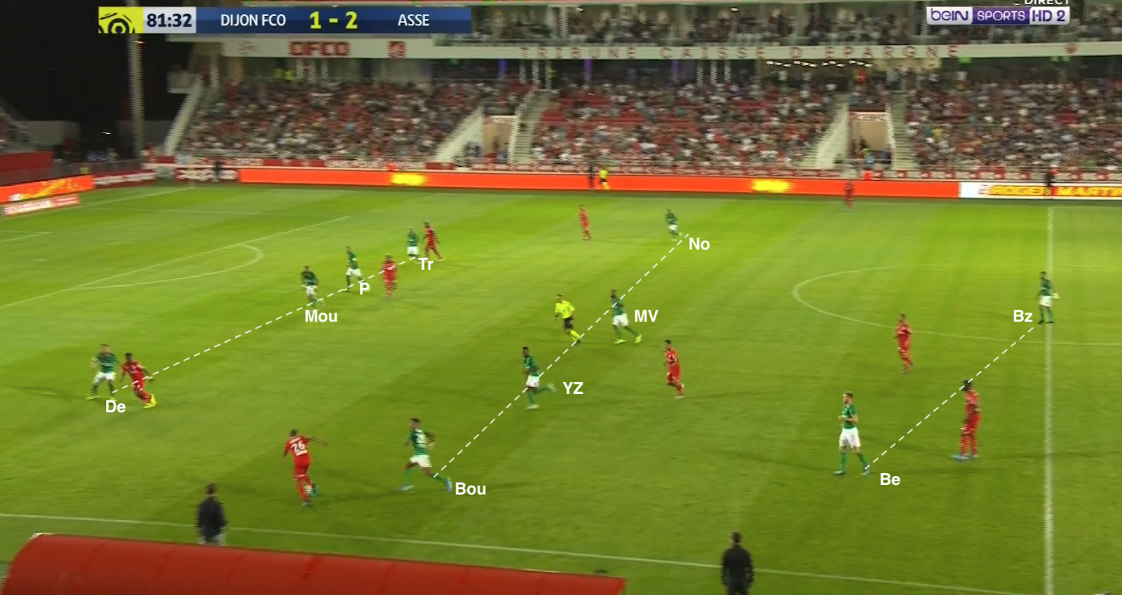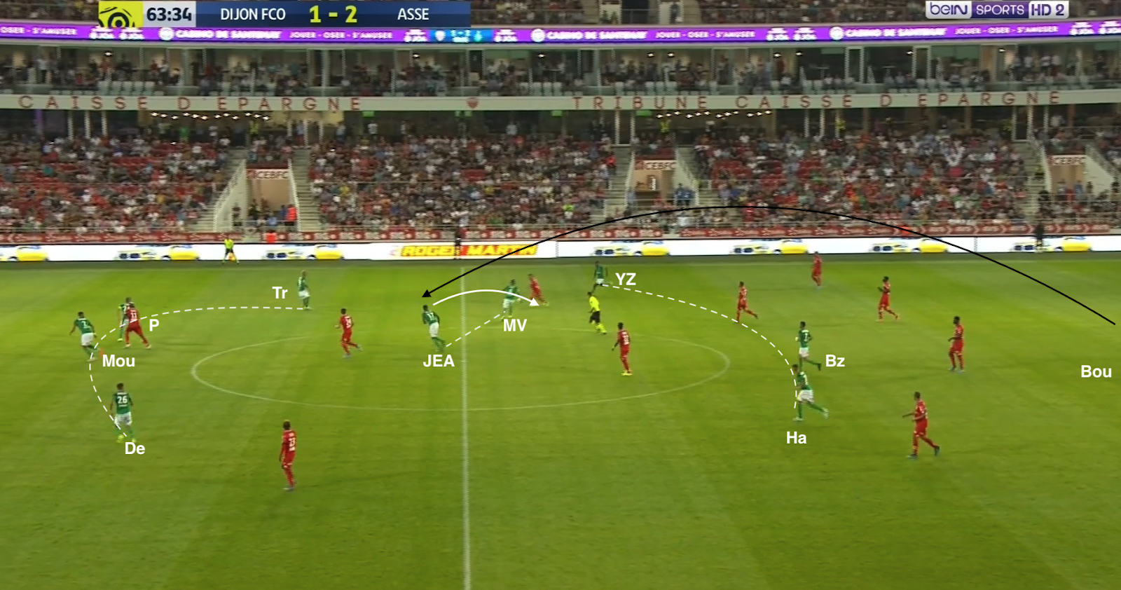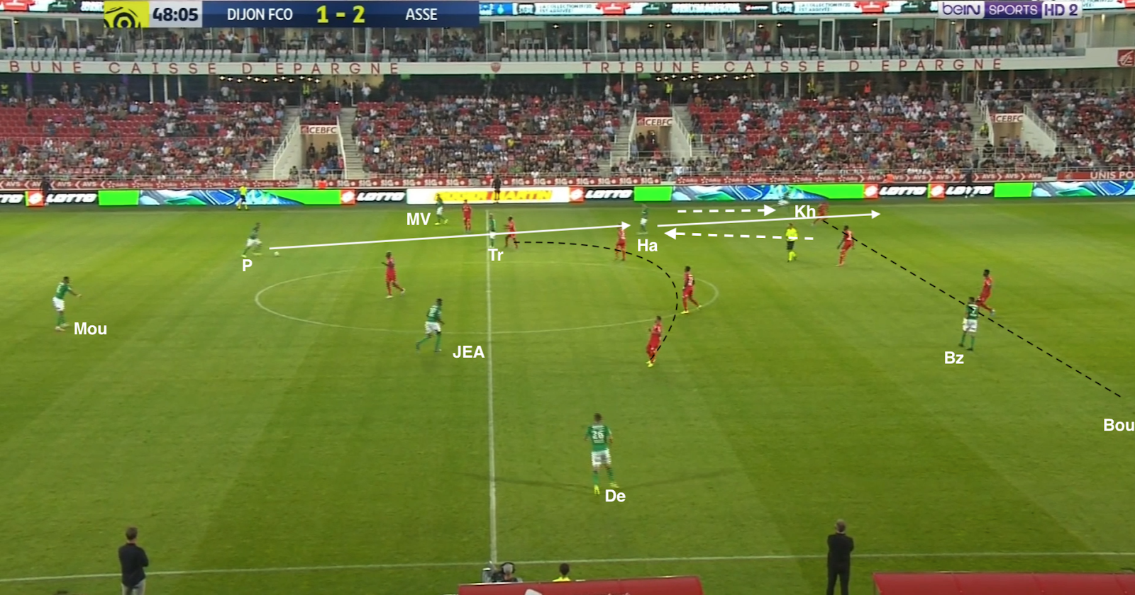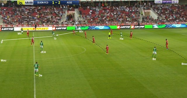 Les milieux montent, la défense ne monte pas, Khazri ayant fait un appel en profondeur. Et Hamouma fait l'appel inverse, se plaçant pile dans l'espace libéré par l'adversaire. Il est trouvé par la passe précise de Perrin et lance de suite Khazri en profondeur. L'attaquant stéphanois temporise en attendant de la présence dans la surface...