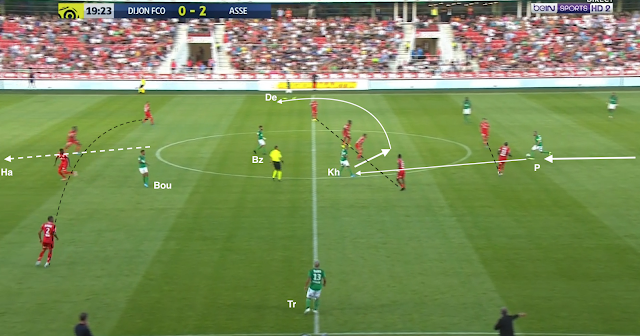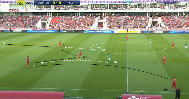 Les Dijonnais jouent une touche, le défenseur s'appuie sur un milieu, puis sur un autre :