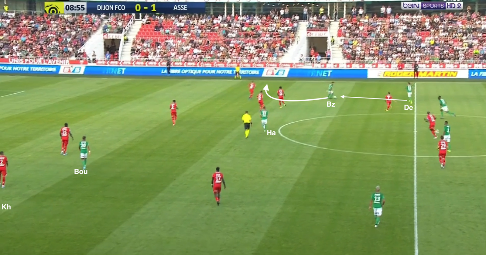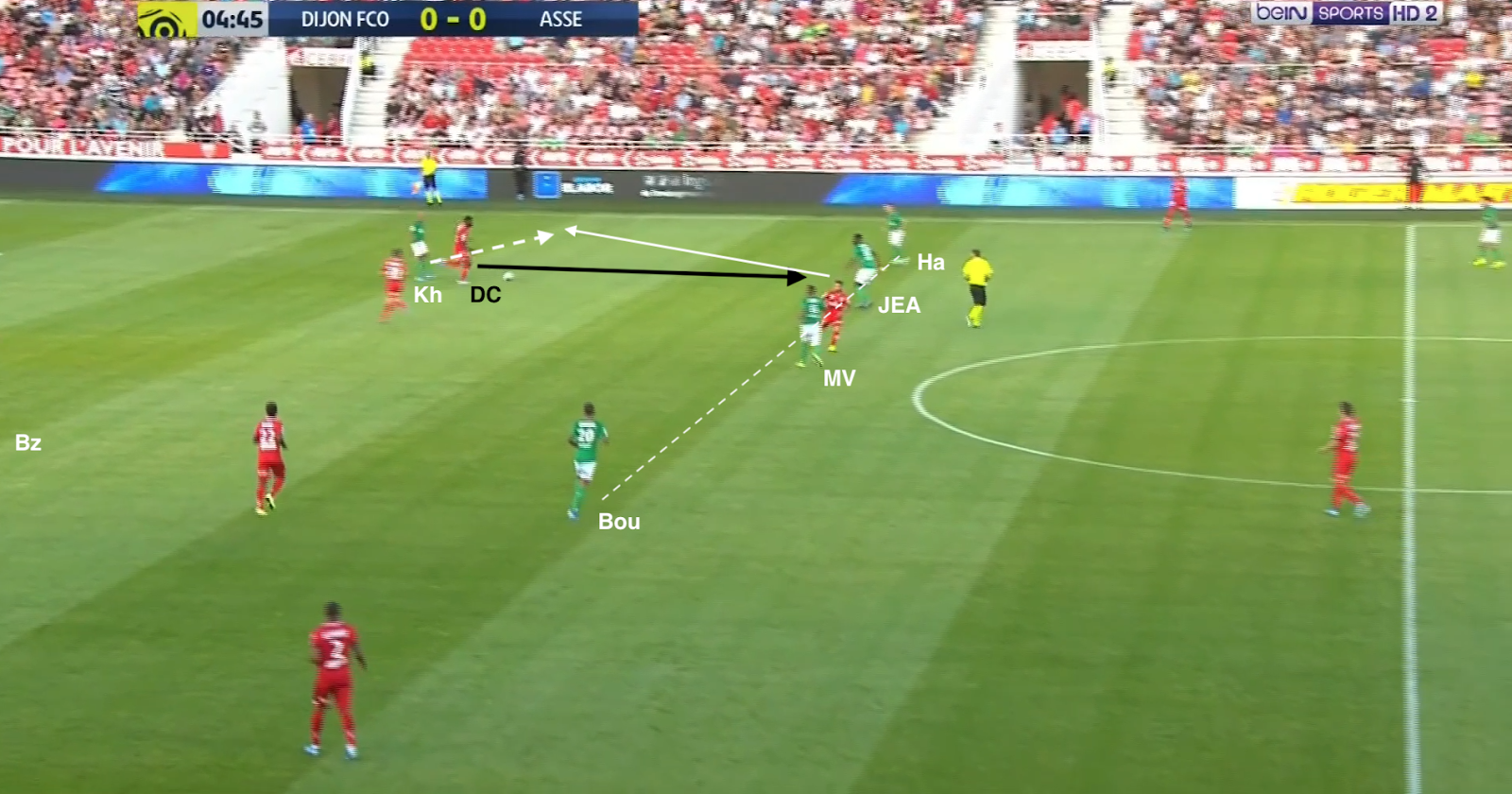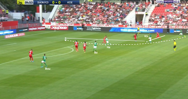 En début de match les Verts étaient présents dans le camp adverse pour empêcher les Dijonnais de construire proprement, comme dans cet exemple à la 5e minute :