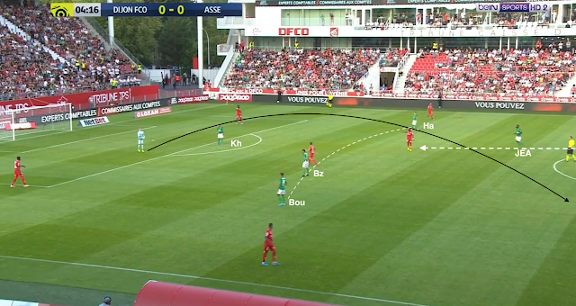 Les 3+1 offensifs stéphanois sont bien visibles avec Khazri en pointe et Boudebouz dans l'axe. Jean-Eudes Aholou vient aussi au marquage d'un milieu axial adverse pour couper toute possibilité de jeu court. Le goal adverse dégage donc loin et Perrin gagne le duel aérien, mais le ballon sort du terrain :