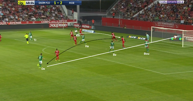 C'était la dernière action construite proprement par l'ASSE en première période. Les Stéphanois ont complètement abandonné la possession jusqu'à la pause (37% à partir de la 20e minute), défendant de plus en plus bas, subissant le pilonnage adverse basé sur des longs ballons. Et concédant finalement la réduction du score sur un penalty obtenu après un n-ème coup de pied arrêté dijonnais (8 corners et plusieurs coups francs autour de la surface en 1MT).