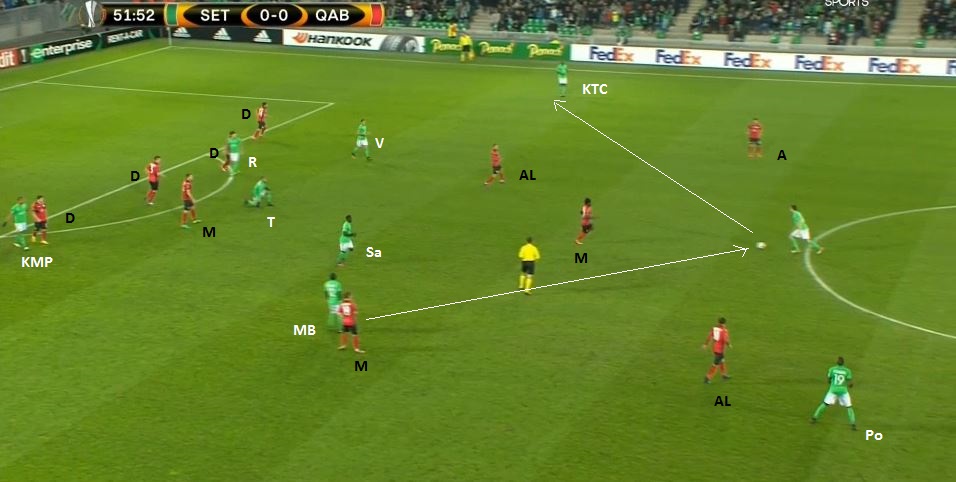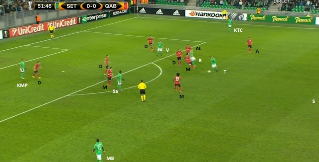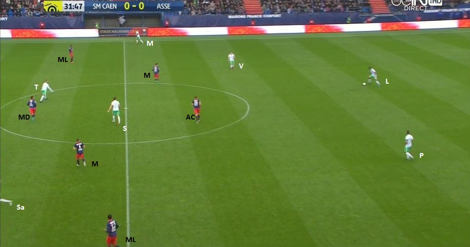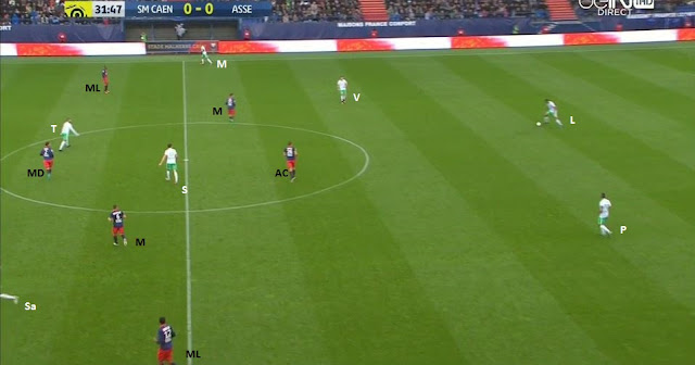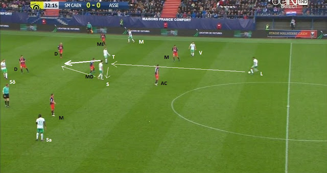 Le ballon est dans la défense, on prépare une attaque placée. On peut bien voir la première partie du bloc adverse (4-1-4-1) avec le milieu défensif, la ligne de quatre milieu et l'avant-centre, ainsi que le double piston de nos deux milieux relayeurs, Veretout descendant offrir une option à Lacroix et Saivet y allant vers la défense. Mais surtout on voit Tannane qui se place dans la zone de la sentinelle (MD - milieu défensif) adverse, appelant avec ses bras les ballon.