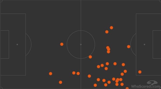 Dans ce match de Coupe d'Europe, Tannane a joué 62 minutes, quasiment toutes dans le couloir droit, comme l'atteste cette image des endroits d'où il a effectué ses 34 passes pour ses coéquipiers (sur 50 ballons joués en total, soit un ratio de 68%) :
