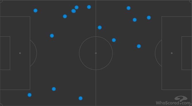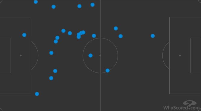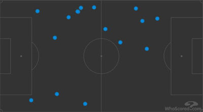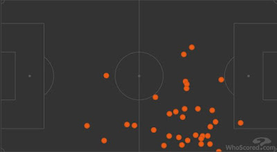 Dans cette image, on attaque de droite à gauche et on voit bien que la plupart des passes qu'il a effectuées (23 sur 30 ballons joués, donc 76%) viennent d'une position axiale. Non seulement il a appelé le ballon dans l'axe, entre les lignes, mais de là-bas il a souvent cherché le jeu court, les combinaisons avec ses partenaires, comme dans cet exemple :
