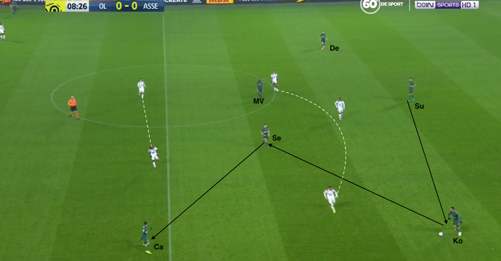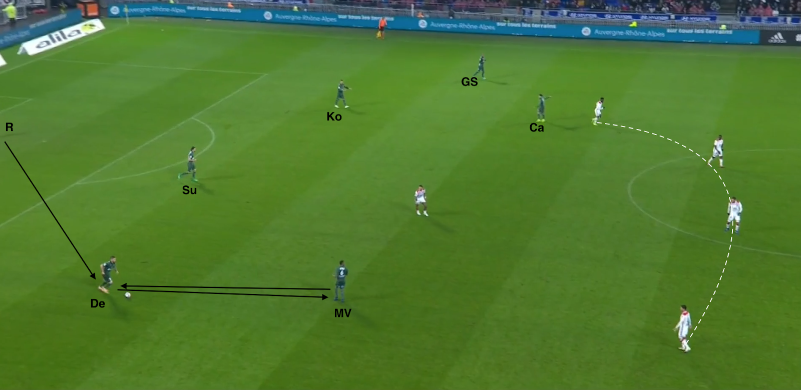 Les 5 défenseurs stéphanois sont en place, la paire Selnaes-M'Vila surveille un milieu axial et un attaquant (les deux autres étant dans la défense). Le rôle des trois devant (Diony-Cabella-Khazri) est d'empêcher que le ballon arrive facilement vers les attaquants, mais quand un défenseur central décide de monter balle au pied, il peut facilement passer entre eux et monter une bonne trentaine de mètres sans problème :