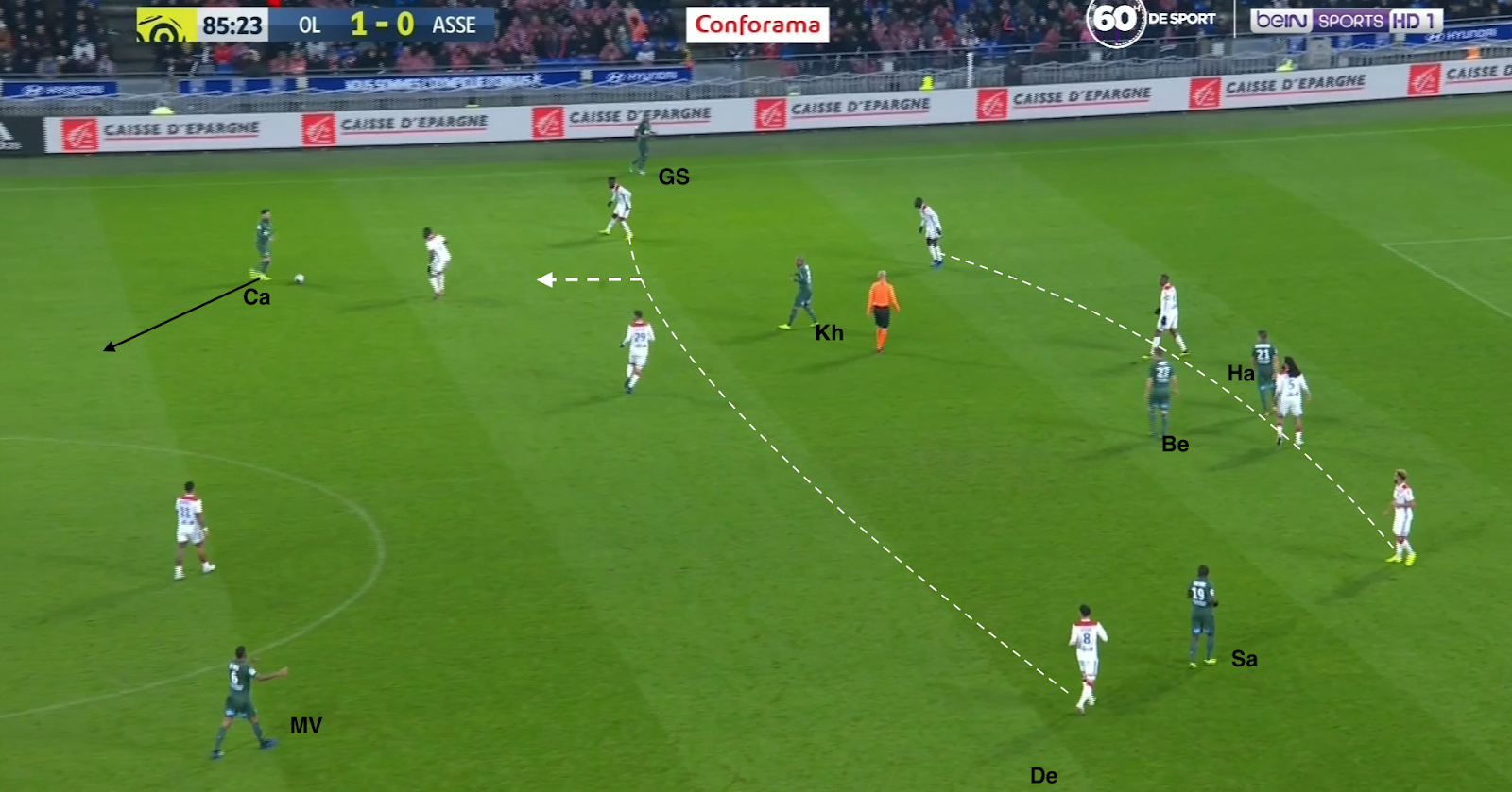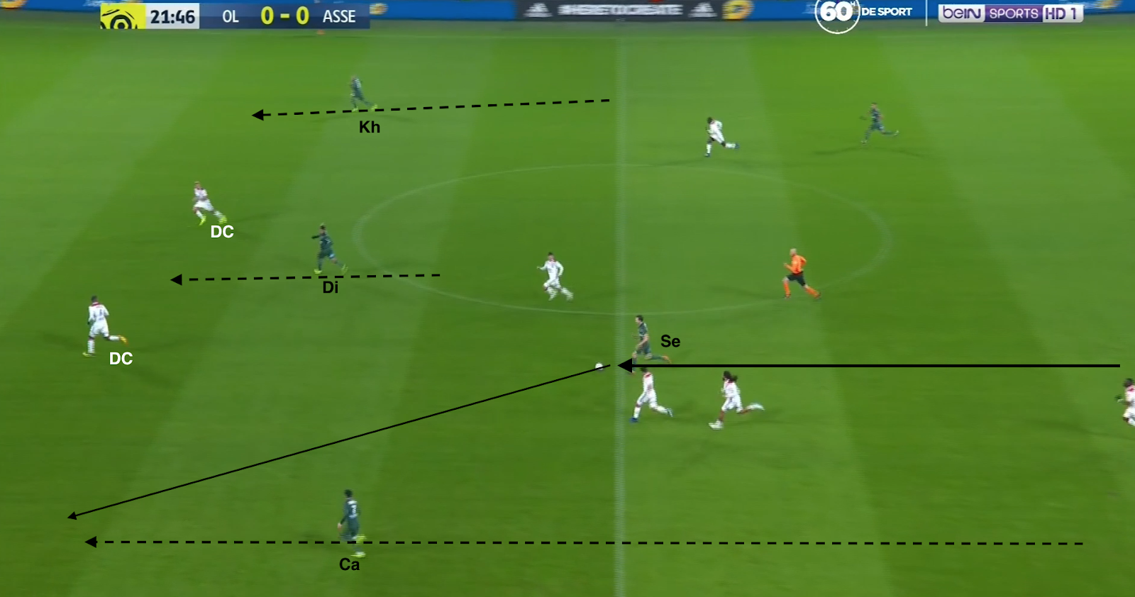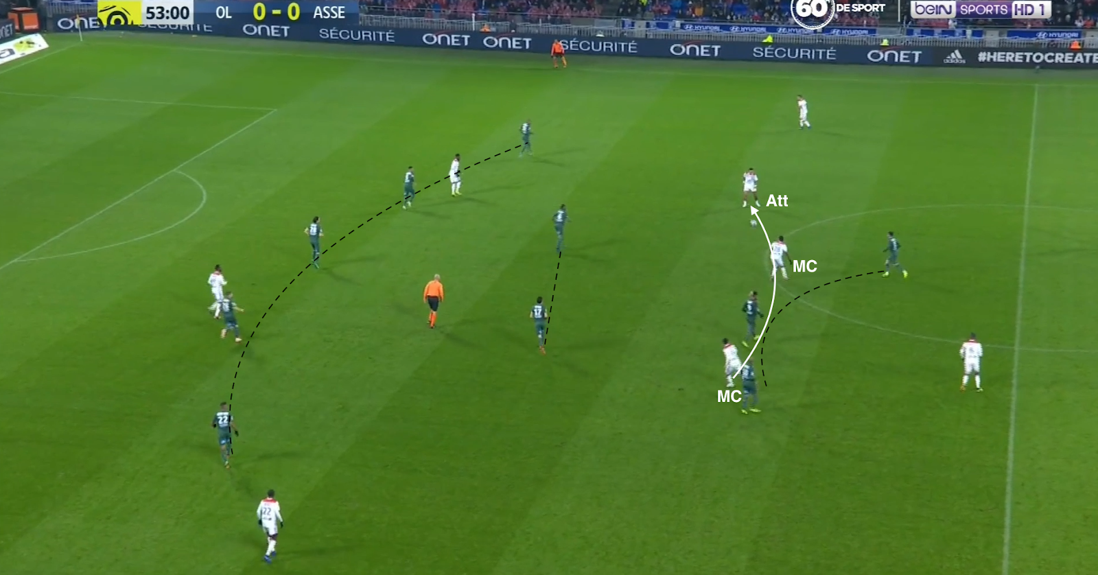 Pour un exemple de positionnement et envie, une action qui commence à la 53e, avec le ballon dans la défense lyonnaise :