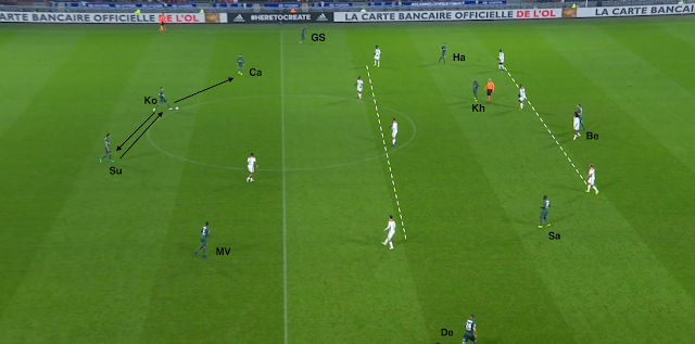 En plus d'illustrer les systèmes en place, l'image ci-dessus montre aussi le placement particulier des deux attaquants lyonnais. Quand ils décrochent, ils sont pris par la paire Selnaes-M'Vila. S'ils montent plus haut, ils peuvent être pris par des défenseurs. Ce qui sera aussi le cas si un des milieux axiaux passe la première ligne défensive des Verts (Diony-Cabella-Khazri) :