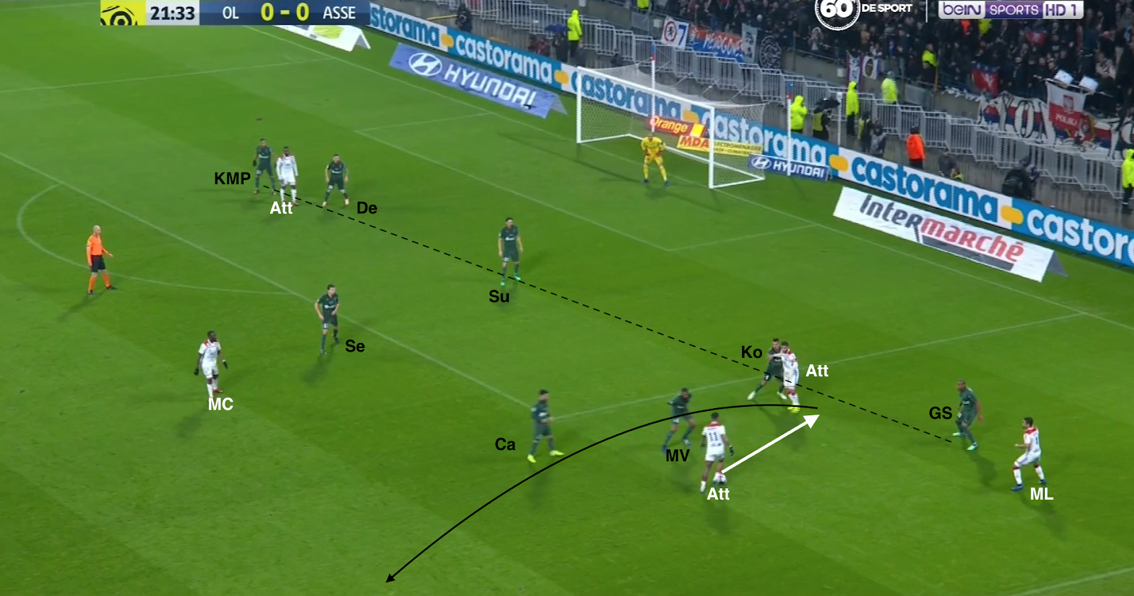 Pour un exemple de positionnement et envie, une action qui commence à la 53e, avec le ballon dans la défense lyonnaise :