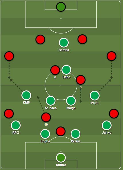 KMP est obligé de le chercher, le 10 fait un appel dans la zone libérée, Maïga le suit, alors le 6 fait un appel dans la zone libérée... pas suivi par Dabo. Pire, RPG se trouve très loin de l'ailier adverse (son adversaire direct, qui est facilement trouvé - KMP partant de loin, ne peut pas fermer l'angle de passe.