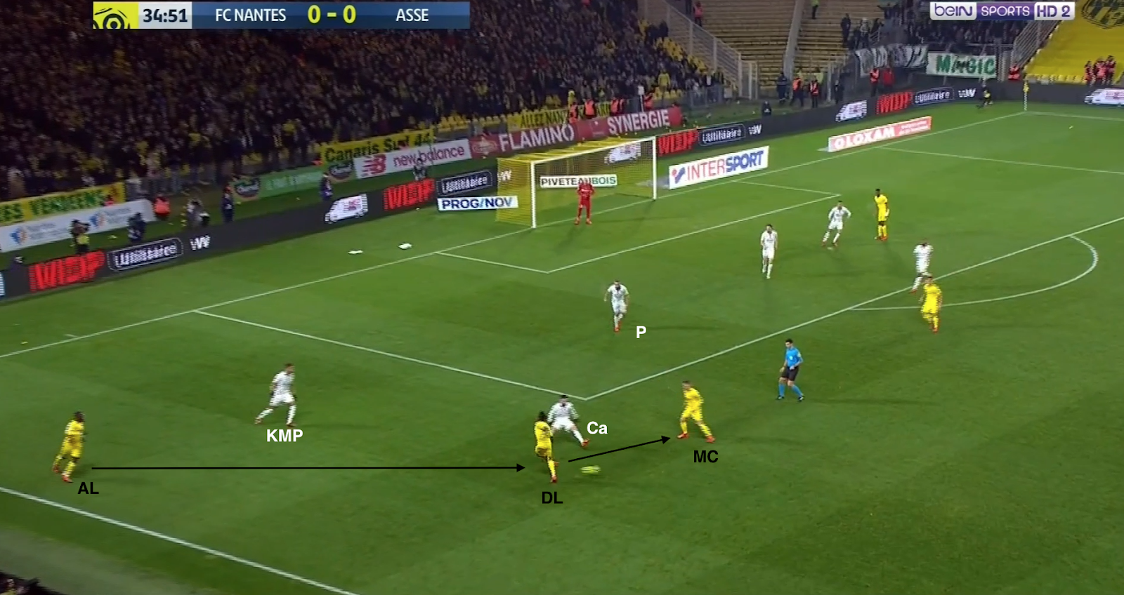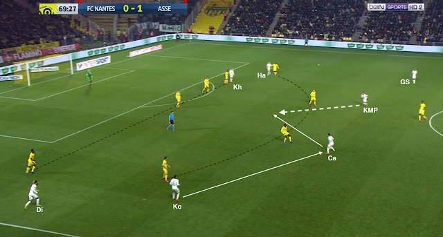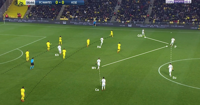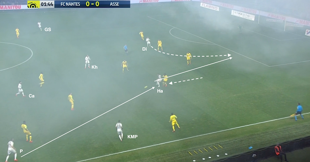 Mais ça n'a pas toujours suffit et les Nantais ont pu profiter de certaines erreurs de placement dans le bloc stéphanois. Par exemple à la 35e :