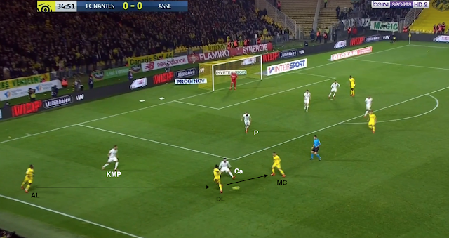 La sortie de balle est très propre, quelques passes à une touche de balle permettent aux Nantais de préparer un contre. Kolo se trouve très haut et les deux milieux défensifs aussi donc ils ne peuvent pas couvrir le couloir gauche. C'est exactement là que l'avant-centre adverse fait un appel :