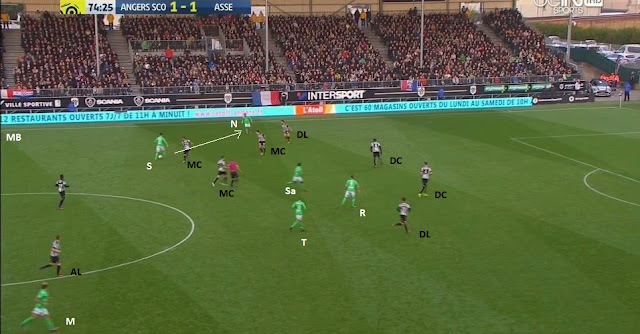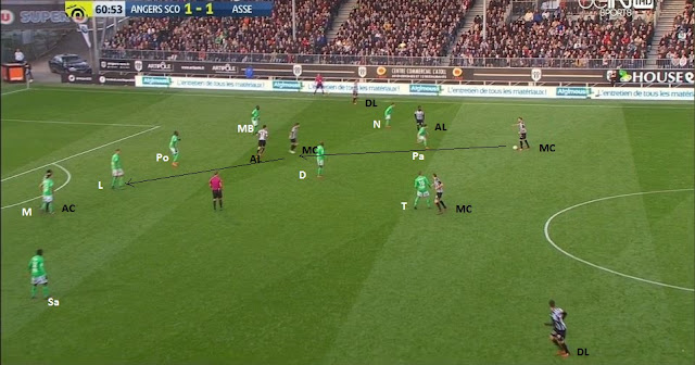 On compte en ce moment 5 Angevins pour 6 Stéphanois, dont Saivet bien démarqué et Malcuit qui arrive dans son dos. Il est évident comment il faut jouer la suite :