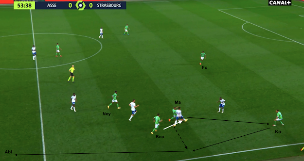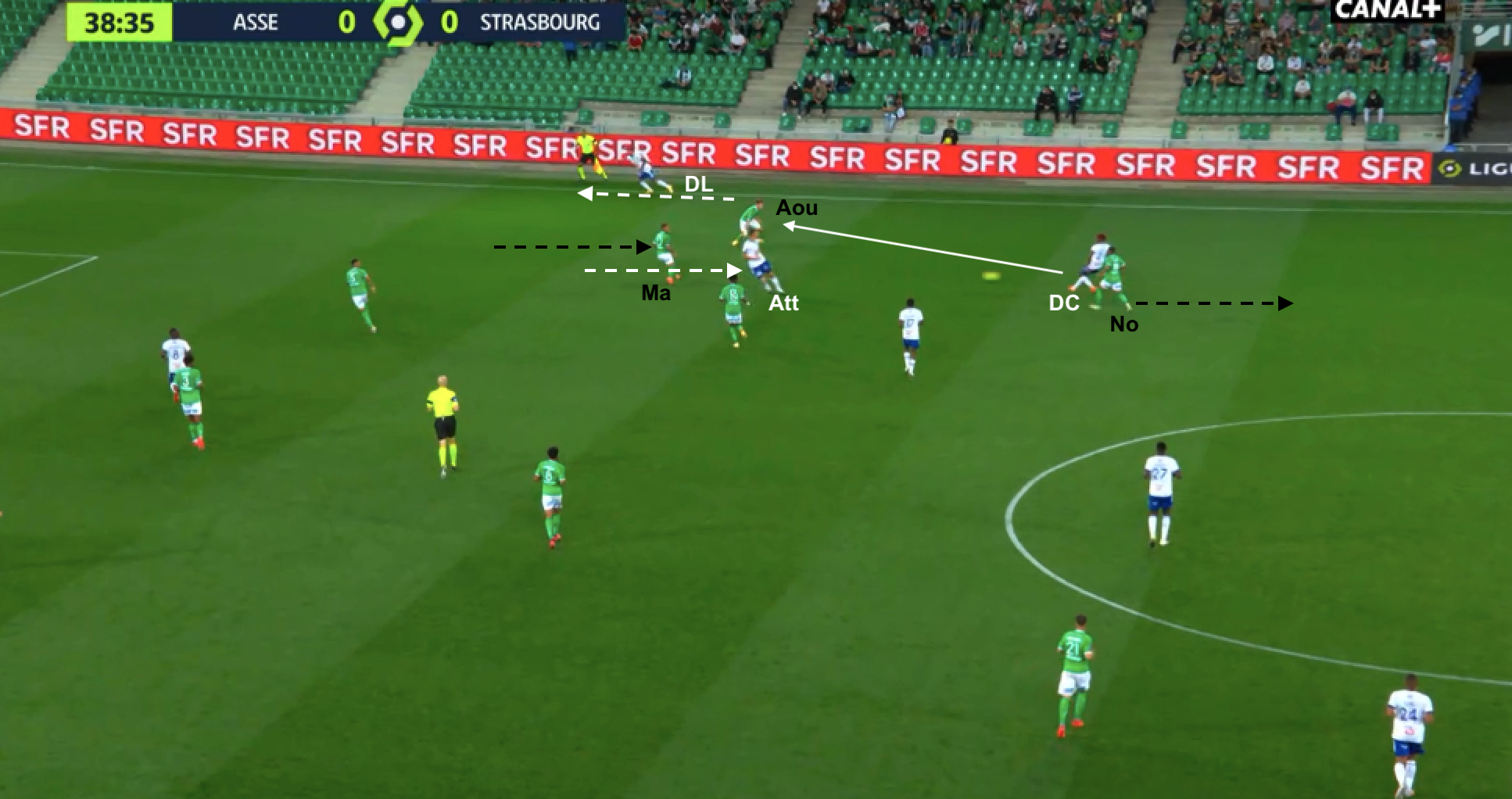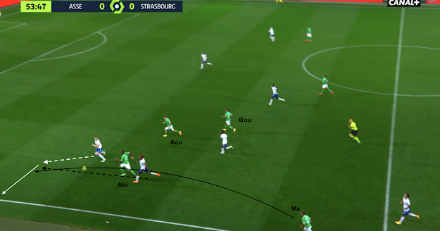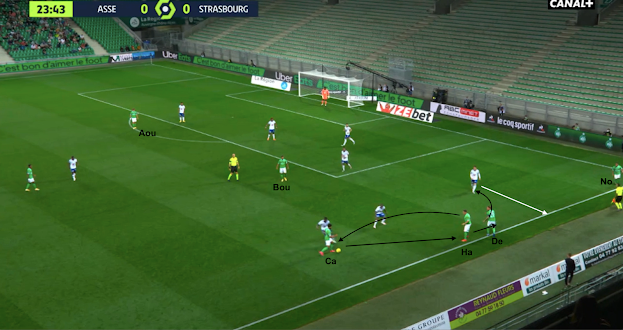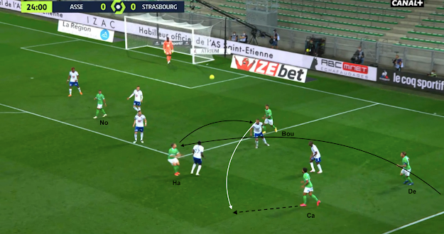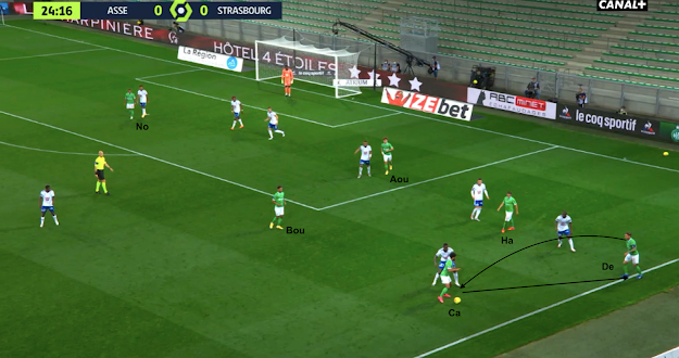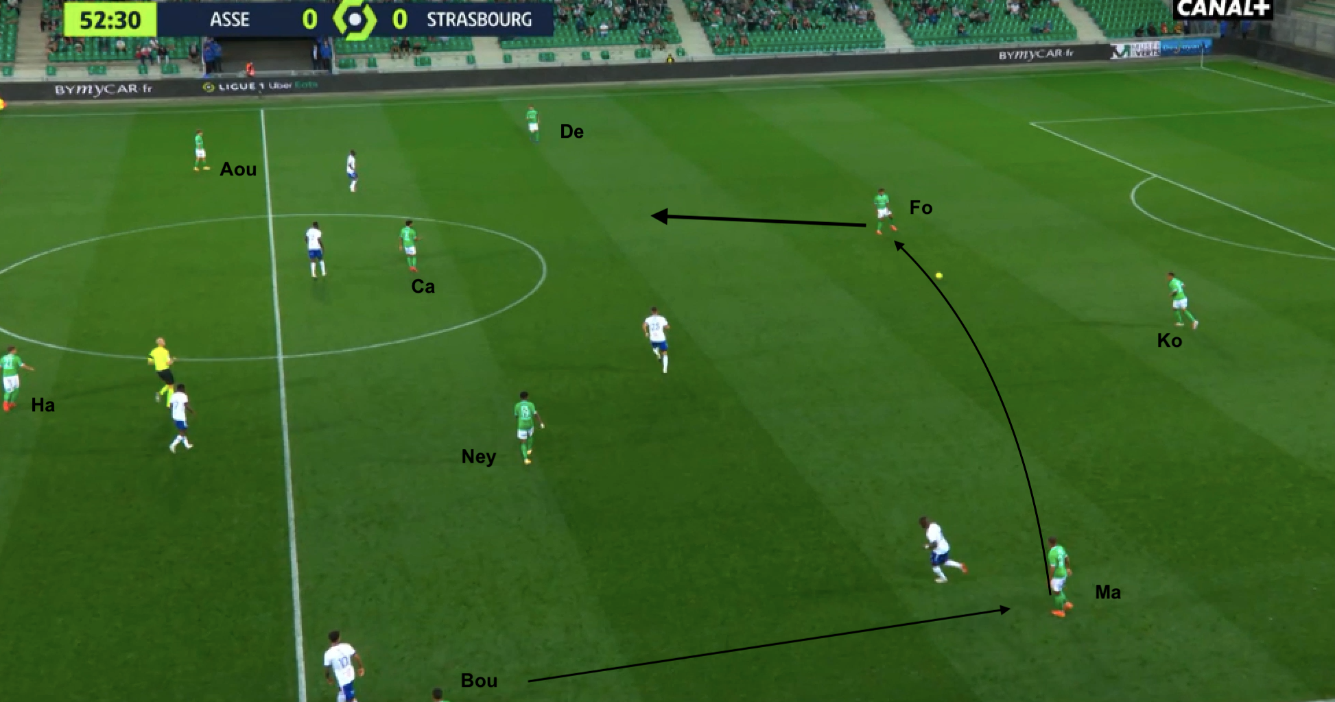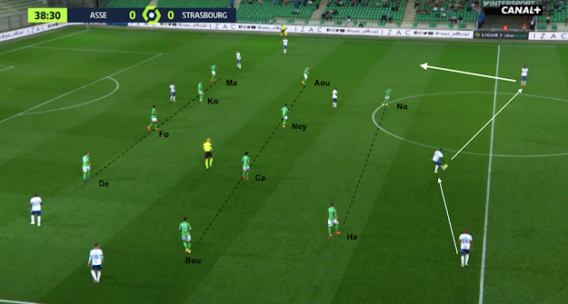 Ce n'était pas la seule fois de la première période où les Verts se sont montrés dangereux en contre, mais ce genre d'occasions a été rare, Strasbourg préférant ne pas se découvrir. Les Stéphanois ont donc dû faire le jeu contre un bloc bien placé en 5-2-3 ou 5-4-1, avec des adversaires qui ont souvent cherché à casser le rythme. Ils ont parfois essayé de trouver des joueurs entre les lignes et ont parfois insisté sur un côté, comme les deux séries d'exemples peuvent le montrer par la suite.
