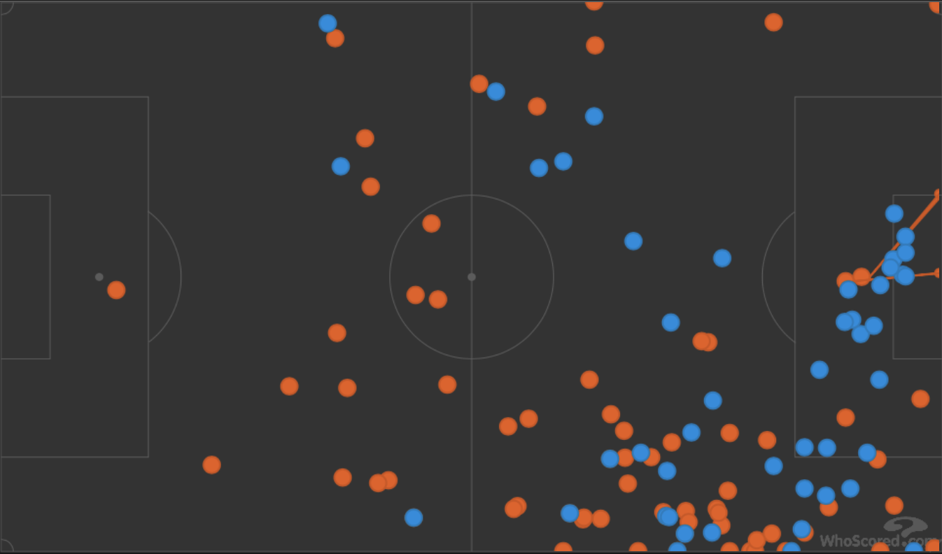 Ils avaient beaucoup insisté sur ce côté droit, comme on peut le voir sur cette image comptant les ballons touchés par l'ASSE (en orange, attaquant de gauche à droite) et Strasbourg (en bleu) entre la 16e et la 25e minute :