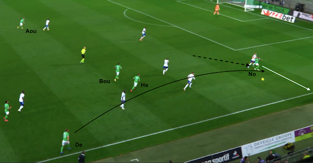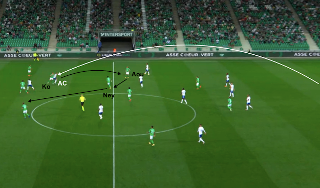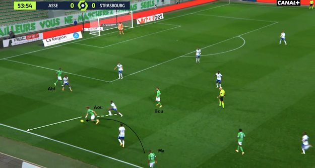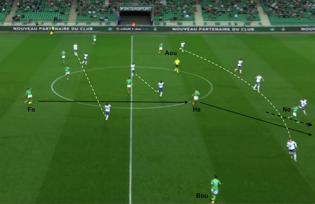 ... il se déplace en conséquence et se trouve 7 secondes plus tard plus excentré qu'Aouchiche. Fofana - Camara - Aouchiche - Hamouma, 3 passes verticales qui cassent toutes les lignes et lancent l'offensif stéphanois dans le couloir droit.