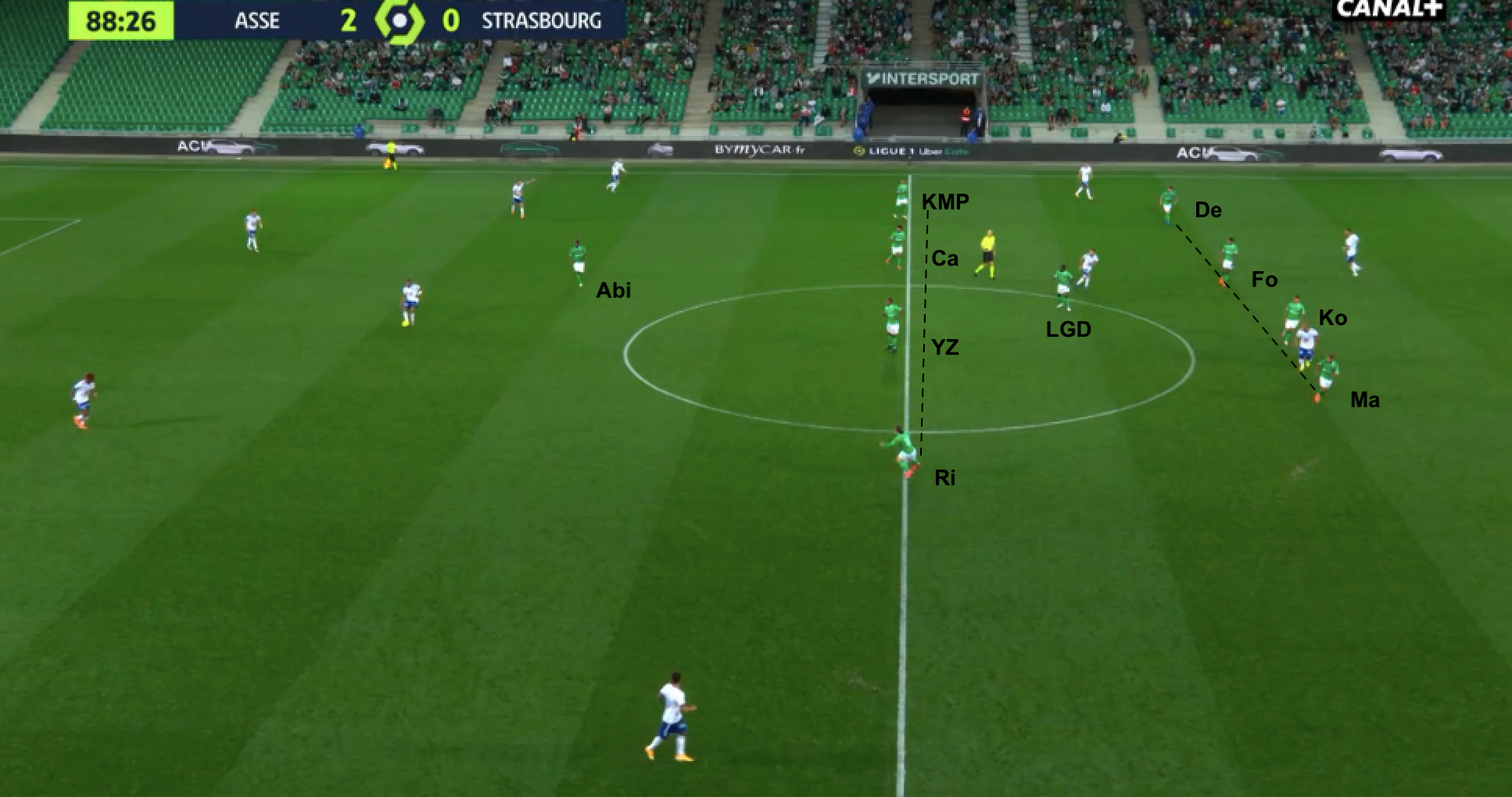 Le ballon est donné à la défense, le bloc adverse se met en place en 5-2-3, les quatre offensifs de l'ASSE se trouvent chacun à leur place :