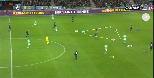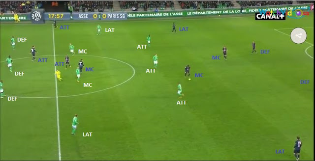 Dans cette capture d'écran on voit bien le 3-4-3 stéphanois en place et deux des trois milieux centraux parisiens descendre pour chercher le ballon.