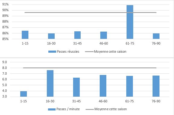 La division par tranches de 15 minutes nous permet de voir que les Verts ont fait un premier quart d'heure très intense, privant les parisiens de ballons (seulement 60 passes faites par eux). Mais ça nous permet aussi de voir un grand QSG après la 60ème minute. Que s'est-il passé à ce moment-là? Une combinaison de trois facteurs qui a plié le match : la fatigue a commencé à peser dans les jambes et le but encaissé (à la 62ème) dans les têtes. Mais aussi le remplacement de Stambouli par Verratti à la 59ème, avec des stats qui parlent d'elles-mêmes: ce dernier a touché 56 ballons et à réussi 92% de ses passes, contre 42 ballons et 80% des passes pour le premier, et tout ça dans la moitié du temps sur le terrain !