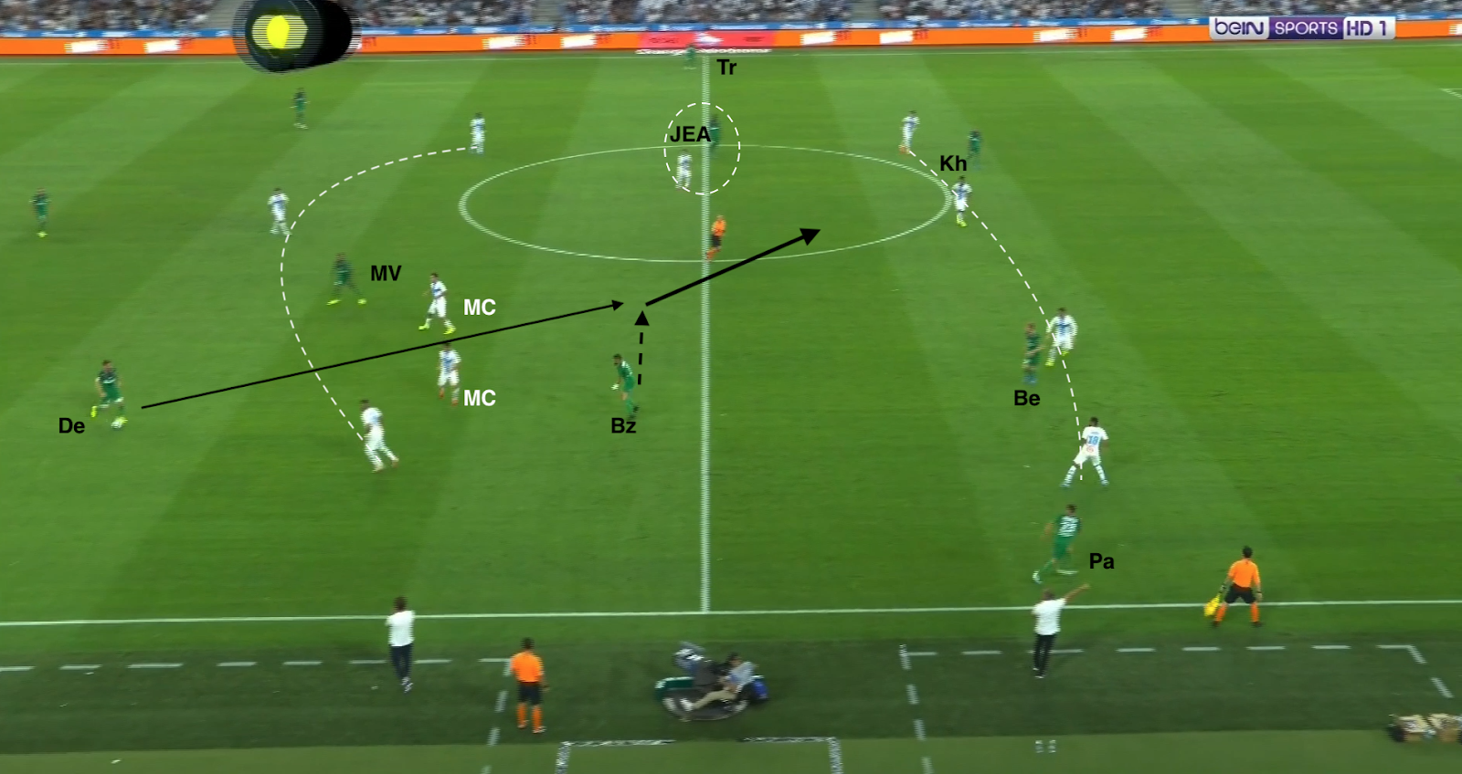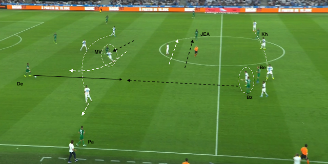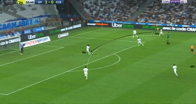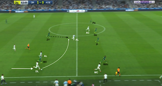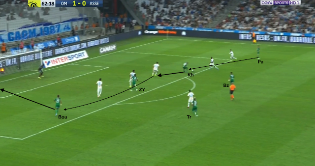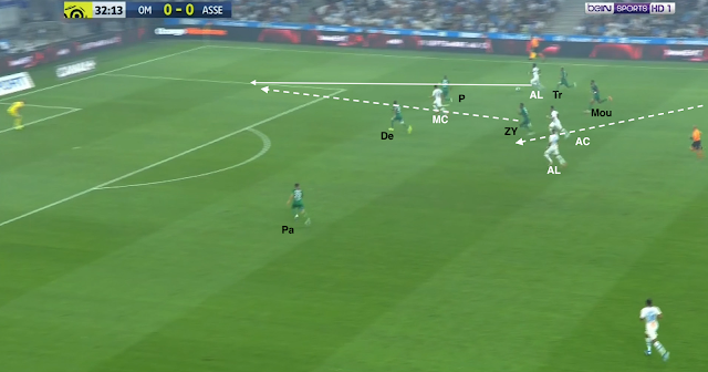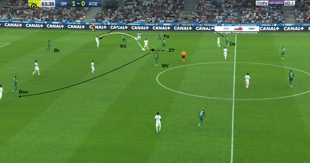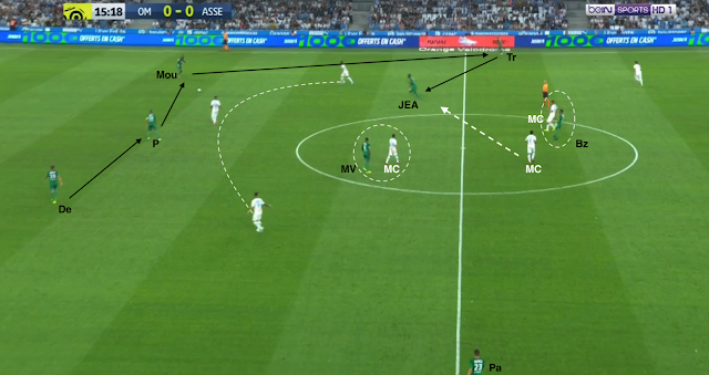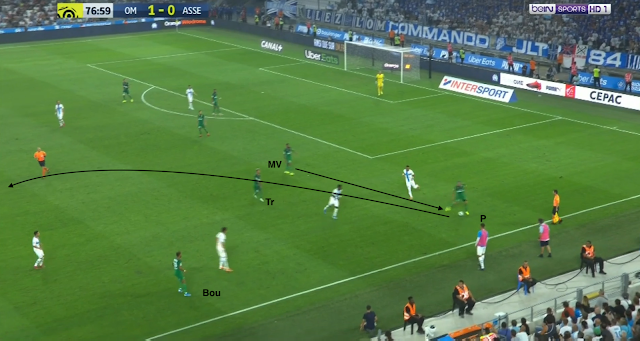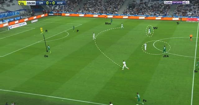 L'ailier droit marseillais descend bas pour combiner avec son latéral. Il est suivi par Trauco (le joueur de couloir côté ASSE), M'Vila cherche un milieu axial, Boudebouz n'est pas loin d'un autre, Youssouf est au marquage du 3e (et d'un ailier très axial). Beric est sur le côté aussi pour presser l'ailier ou le latéral, les Stéphanois sont en place. Mais le une-deux entre l'ailier et l'avant-centre qui décroche est trop rapide pour les Verts : Moukoudi est trop court pour empêcher la combinaison...