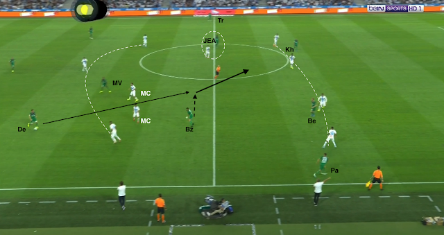 Le système de jeu n'a pas changé après la pause, mais l'approche tactique des Stéphanois, si. Il y a eu moins de possession (50-50 sur la deuxième période) et donc moins d'attaques stériles comme dans les exemples précédents. Et pourtant, les Verts ont été plus dangereux (7 tirs dans le jeu contre seulement 2 en 1MT), grâce notamment à des phases de transition bien négociées, avec du jeu vertical rapide qui suivait des bonnes récupérations de balle.