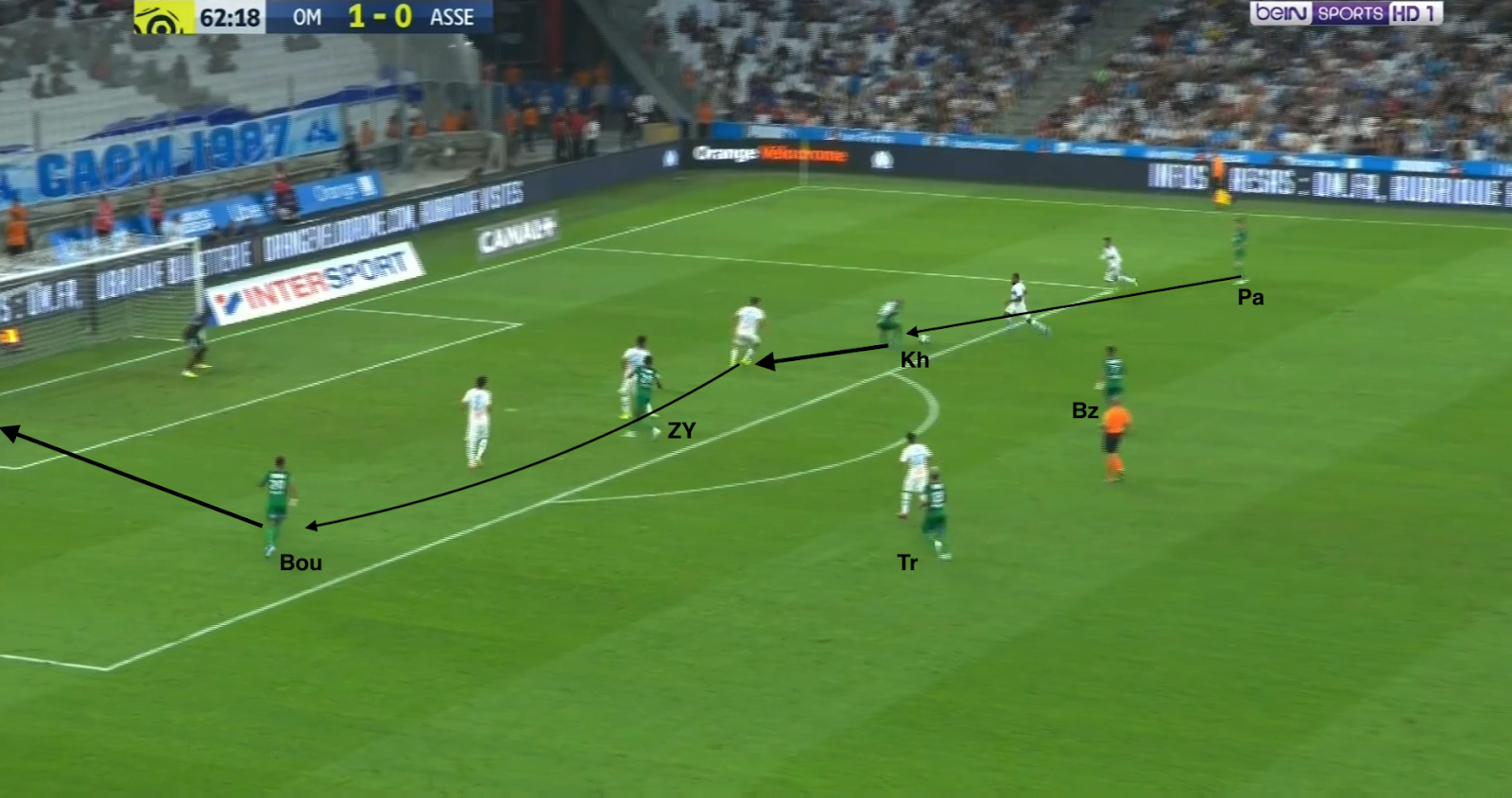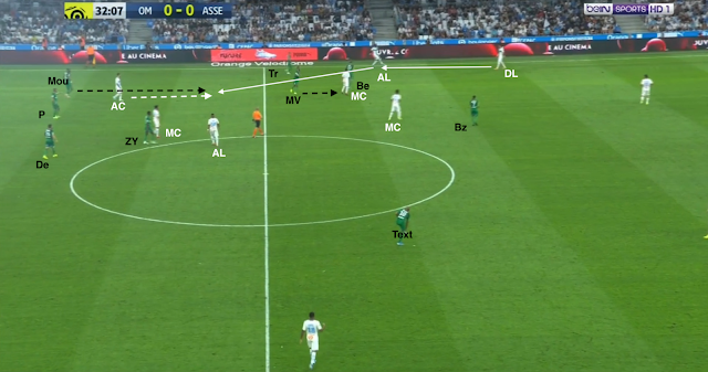 ... surtout que Moukoudi ne peut pas défendre à gauche, étant au marquage d'un milieu et que ni Bouanga ni Trauco n'ont suivi leurs deux adversaires directs, les deux joueurs de couloir droit marseillais. Heureusement pour l'ASSE, Youssouf intercepte la passe vers l'axe du terrain. Il monte ensuite balle au pied...