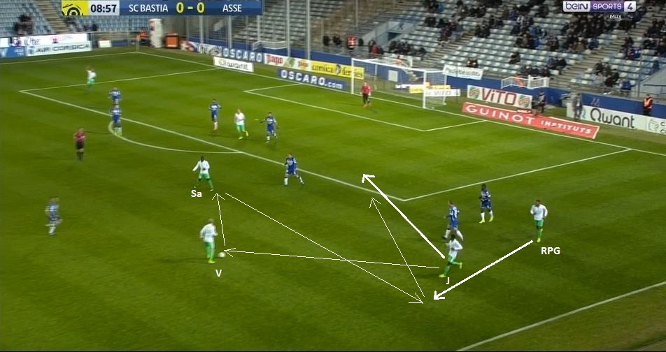 Les Stéphanois étaient haut, donc ils récupéraient le ballon très rapidement, comme par exemple plusieurs fois d'affilée entre la 55ème et la 56ème. Les rares fois que le bloc adverse avait un peu plus d'espace entre les lignes, Saivet y a été trouvé, comme par exemple deux fois de suite à la 54ème. Mais le reste du temps, c'était un jeu de handball, avec un ballon qui circulait d'un côté à l'autre en passant par les défenseurs... et aucun décalage digne de ce nom n'a été créé.