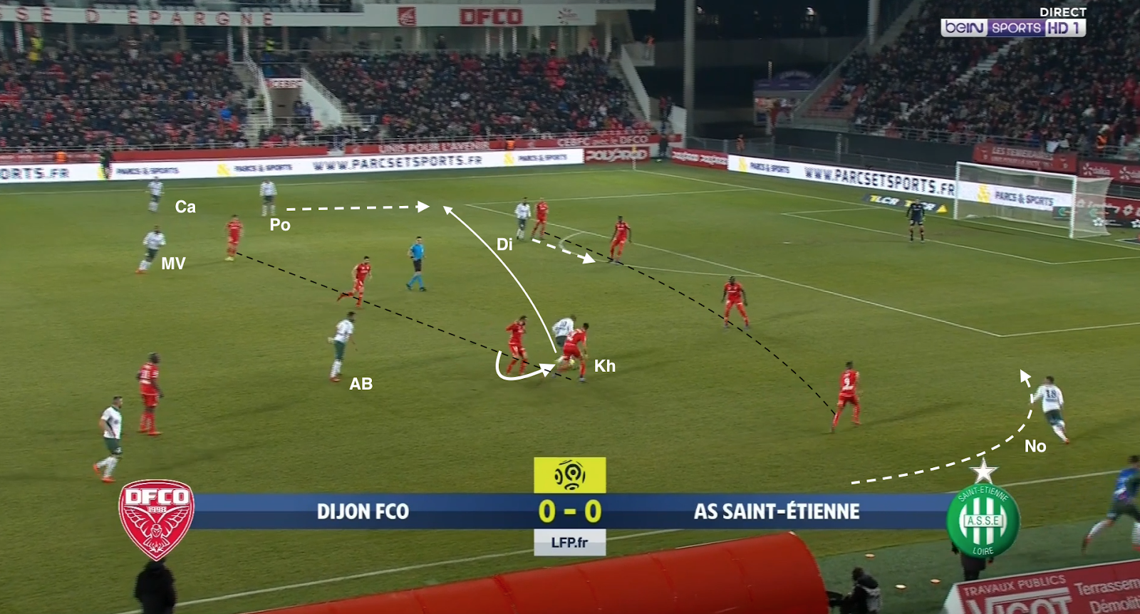 Le contrôle orienté de l'avant-centre élimine deux adversaires et lui permet de se tourner face au jeu. Nordin, le nouveau latéral des Verts, fait un appel à droite mais il n'est pas servi. Diony, auparavant excentré, fait un appel vers l'axe, sans être servi non plus. Mais son appel resserre la défense et un beau décalage est créé à gauche où Khazri envoie le ballon :