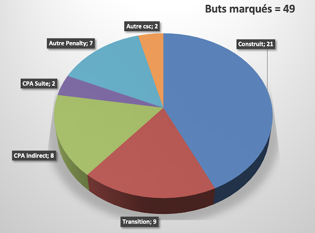 A peine plus d'un but marqué par match, moins que la saison d'avant et ses 59 buts en 38 matchs de Ligue 1. Par contre, la répartition des différents types est quasiment identique, la seule différence notable venant des buts inscrits sur CPA : bien moins proportionnellement lors de la dernière saison. Quand on est moins bien dans le jeu, il est utile de pouvoir compté sur les phases arrêtées, mais les Verts ont régressé aussi dans ce domaine...