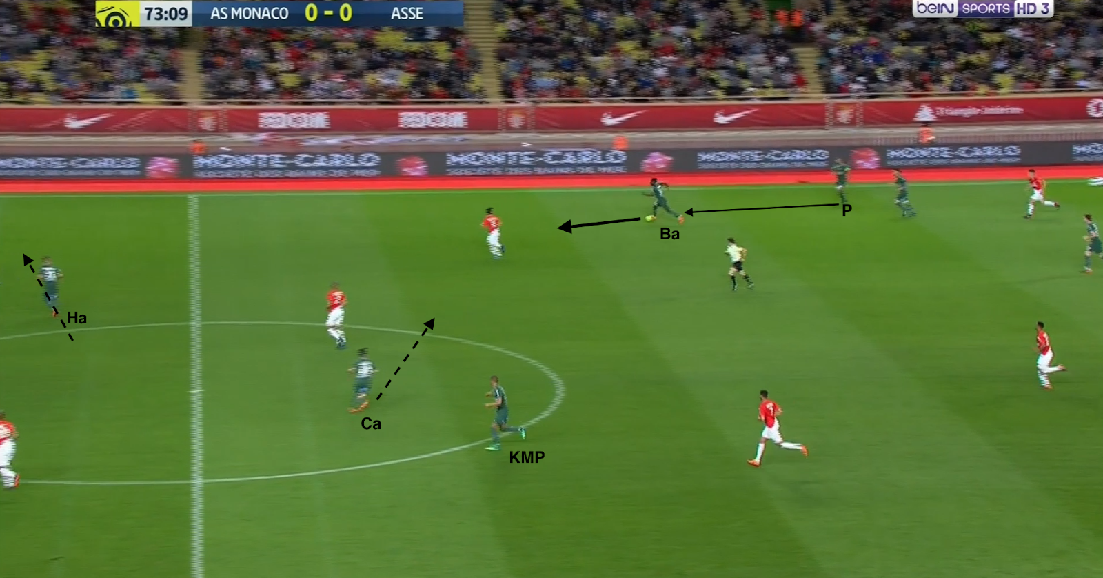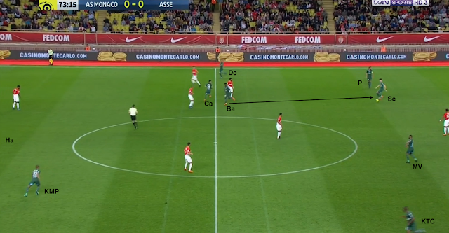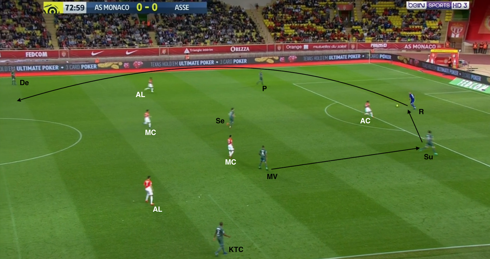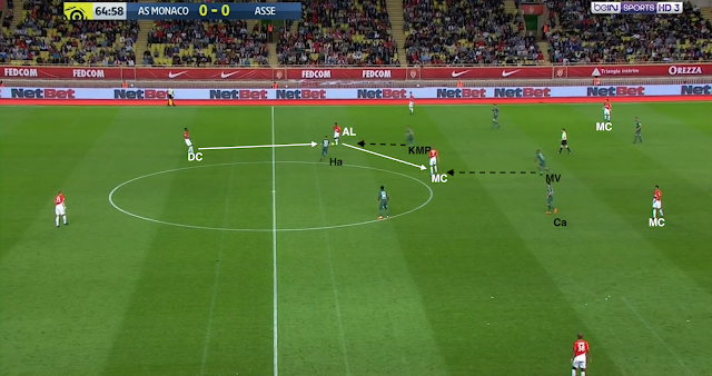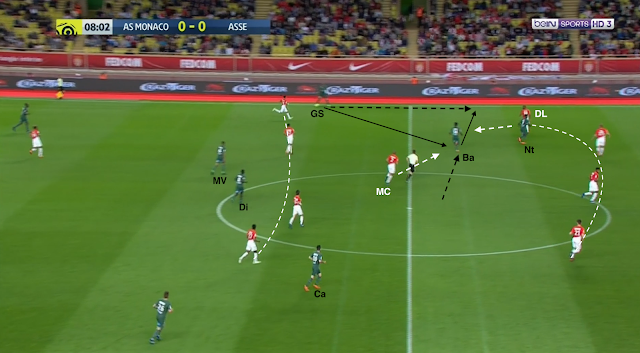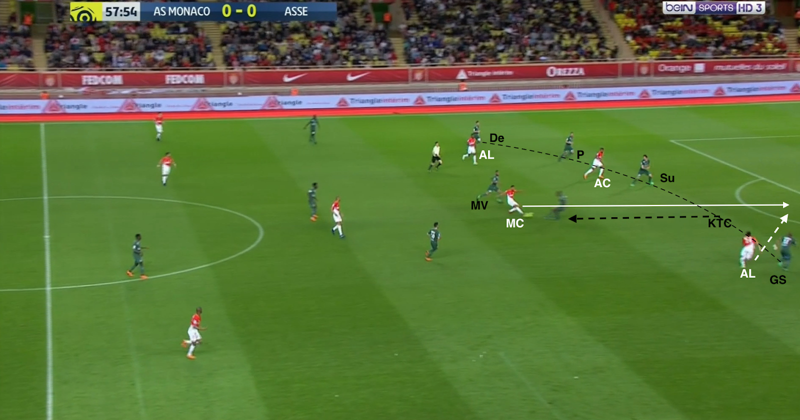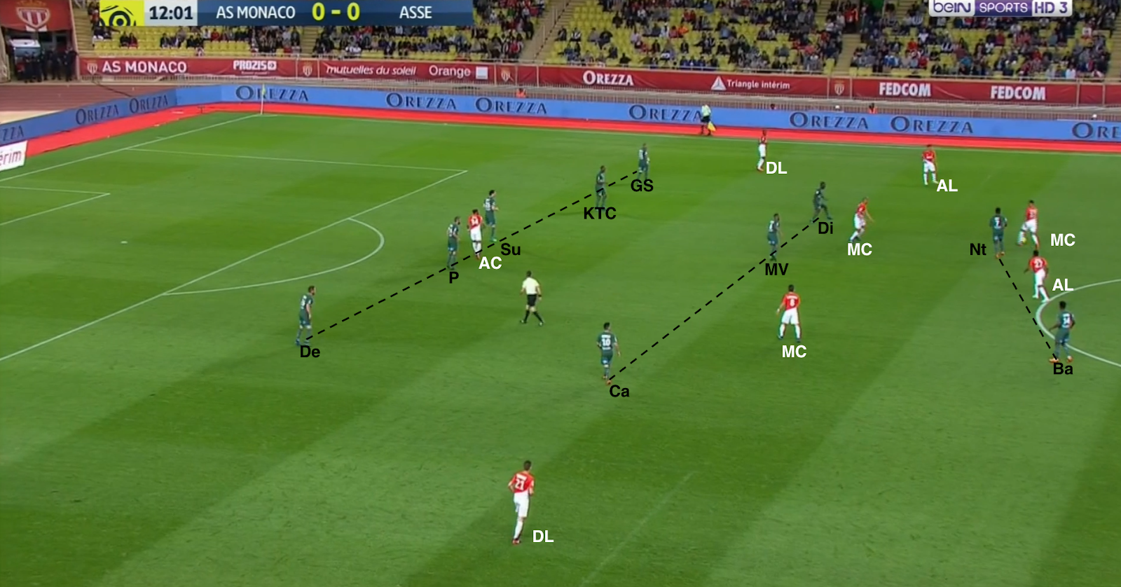 Monaco défend en 4-1-4-1 avec un bloc assez haut : le premier objectif pour les Verts est de passer la ligne de 4 milieux. Et dans un système à 3 défenseurs centraux, le jeu passe de préférence sur les côtés. Dans cet exemple, Cabella est descendu assez bas, avant d'envoyer le ballon vers la gauche via Subotic et KTC, le but étant de contourner les milieux adverses. Une fois ce but atteint, ça dévient plus simple :