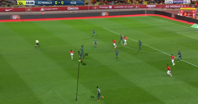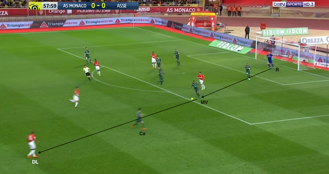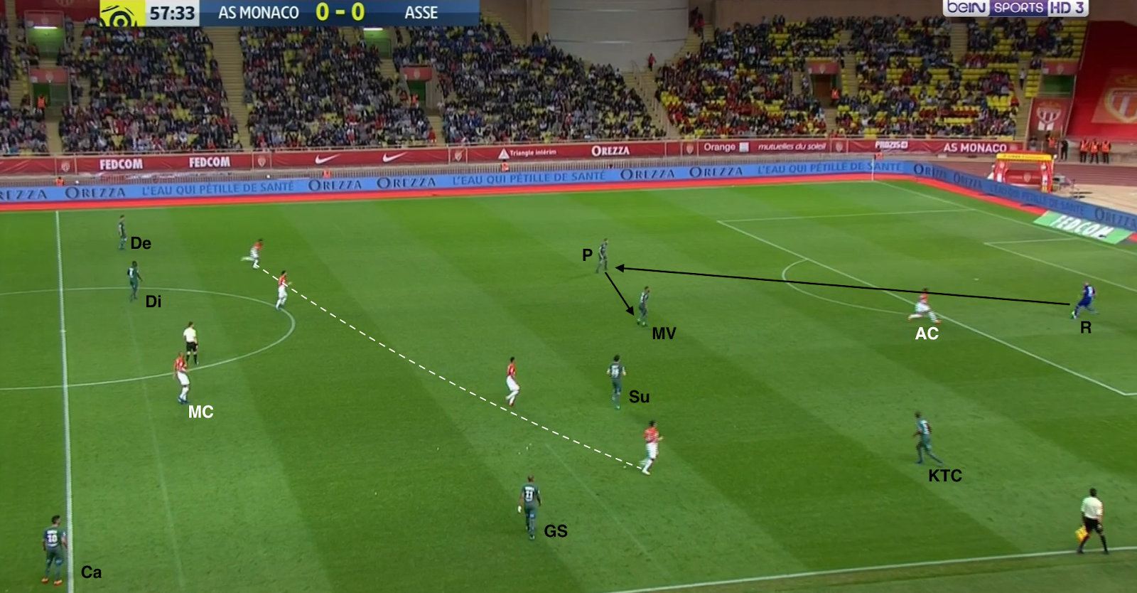 Si l'entrée d'Hamouma à la place de Ntep n'a surpris personne, celle de KMP pour Diousse aurait pu faire croire à une réorganisation tactique. Mais l'ailier stéphanois s'est reconverti en milieu axial, formant avec M'Vila et Cabella la ligne de trois milieux (pas trop bien alignés sur cet exemple). La relance monégasque envoie le ballon dans le couloir gauche, où il n'y a pas de décalage, alors l'ailier revient vers son camp :