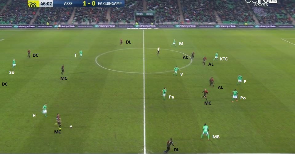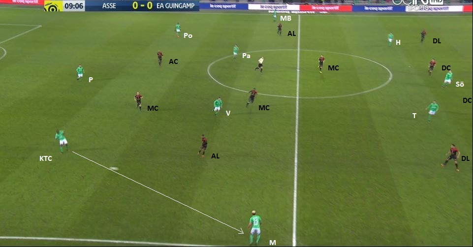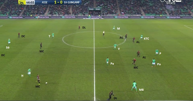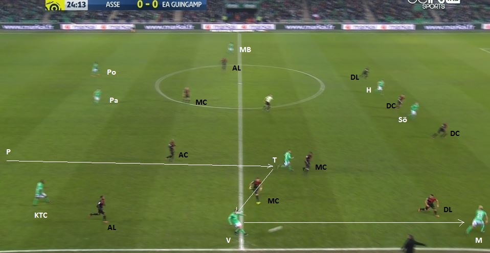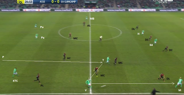 Le un-deux entre Malcuit et Tannane fonctionne parfaitement et à eux deux ils ont pris 4 adversaires : deux défenseurs éliminés pas la passe de Tannane, l'ailier qui suit Malcuit et la sentinelle qui doit couvrir :