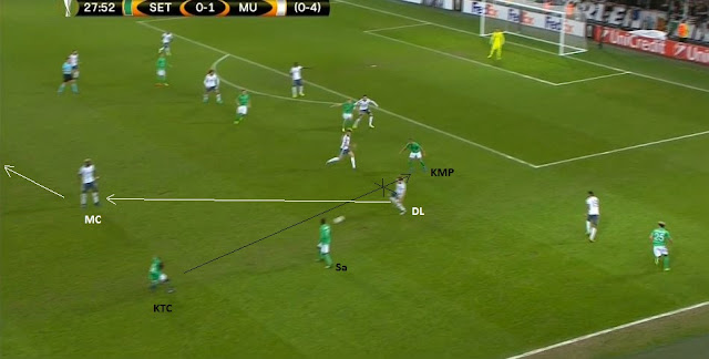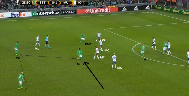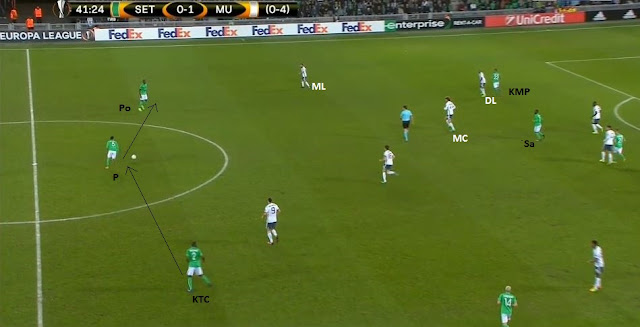 Lors de cette action on a pu voir comment l'axe du terrain était bien contrôlé par les milieux axiaux adverses, très en bloc, très disciplinés, qui empêchaient le jeu vers les attaquants. Dans ce contexte, la question qui se pose est pourquoi on n'a pas écarté sur les côtés, pourquoi on n'a pas étiré le bloc adverse, ces trois milieux, histoire de créer de la place entre eux ? Il est probable que c'est pas nos joueurs qui n'ont pas voulu le faire, mais qu'ils ont été "poussés" vers l'axe par l'adversaire - Perrin le reconnaissant à mi-mots après le match. Si on regarde rapidement une autre attaque, une grosse dizaine de minutes plus tard, le jeu est envoyé de la droite vers la gauche, de Malcuit, en passant par Veretout, KTC et Pajot, jusqu'à Pogba :