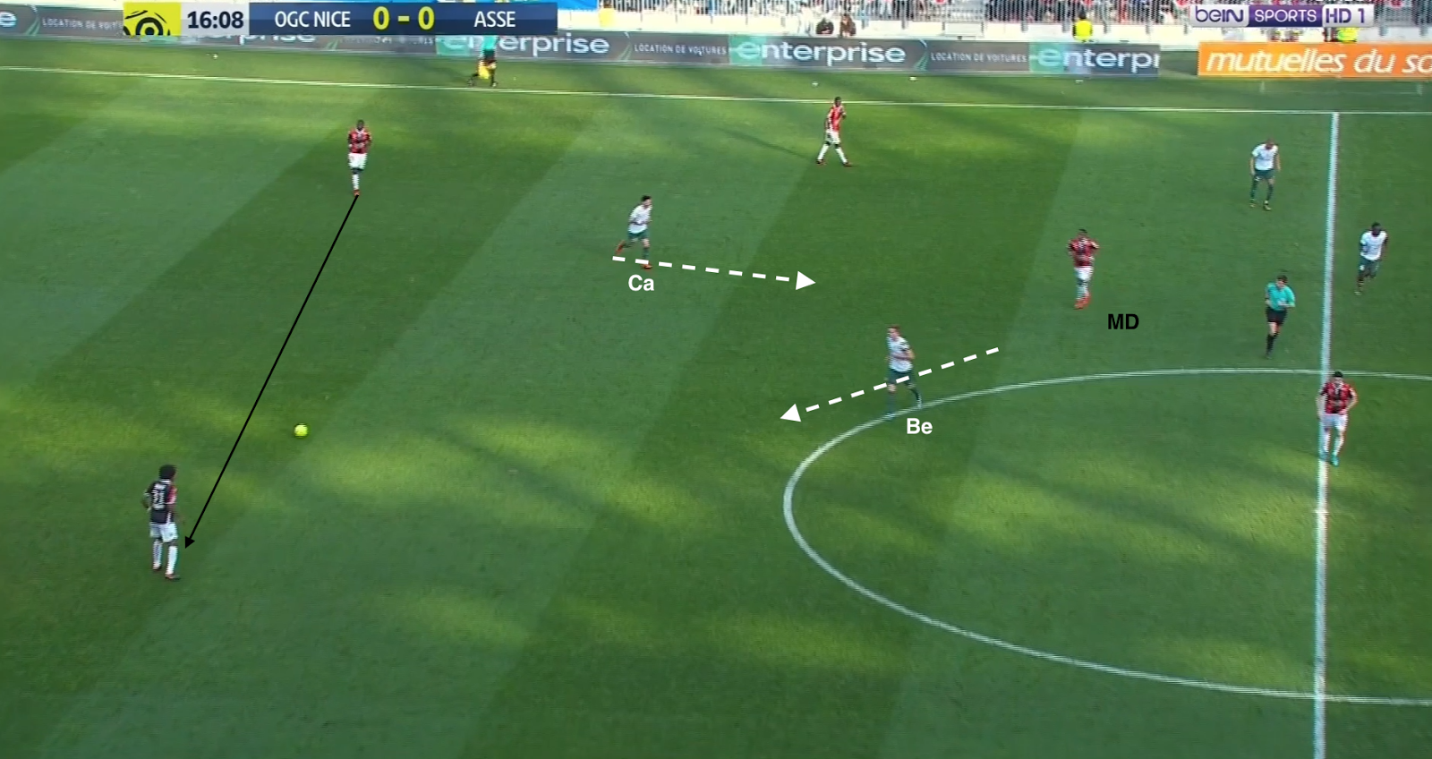 Les défenseurs niçois combinent et cherchent le milieu défensif. La ligne de 4 milieux stéphanois est en place, Beric et Cabella n'en font pas partie, ils pressent le milieu qui envoie en catastrophe vers son gardien. La relance se fait avec un défenseur central...