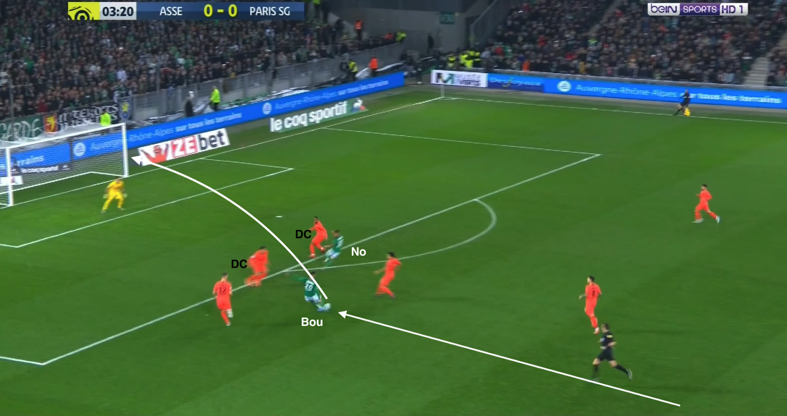 Il lance immédiatement Bouanga, et comme Nordin part en contre aussi, les Verts se retrouvent à 2-contre-2 avec les centraux parisiens. Leurs courses ne sont pas bien coordonnées (pour essayer d'écarter la défense)...