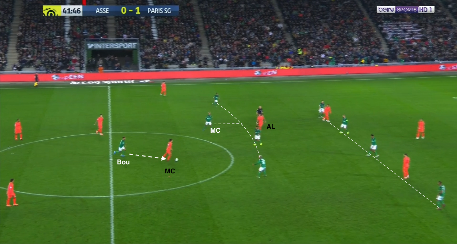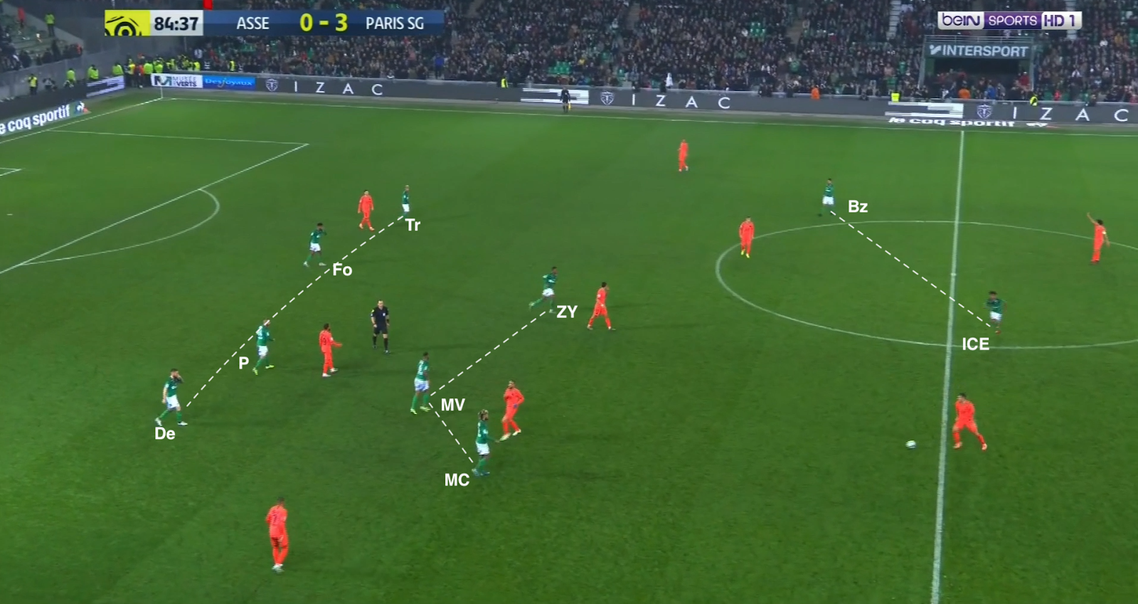 Le 4-4-2 parisien a rendu la vie dure au milieu stéphanois, parce que les couloirs étaient pris par des latéraux, les deux avant-centres monopolisaient la défense et les deux ailiers se plaçaient dans l'axe, créant ainsi un surnombre dans cette zone du terrain. Le plan des Verts était d'empêcher la construction adverse et procéder par des contres, comme dans cet exemple à la 3e minute, où la défense adverse garde le ballon, s'appuie sur un ailier (axial), avant de changer de côté, vers la droite :