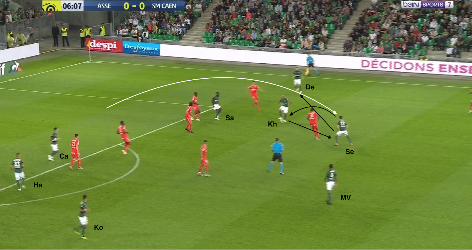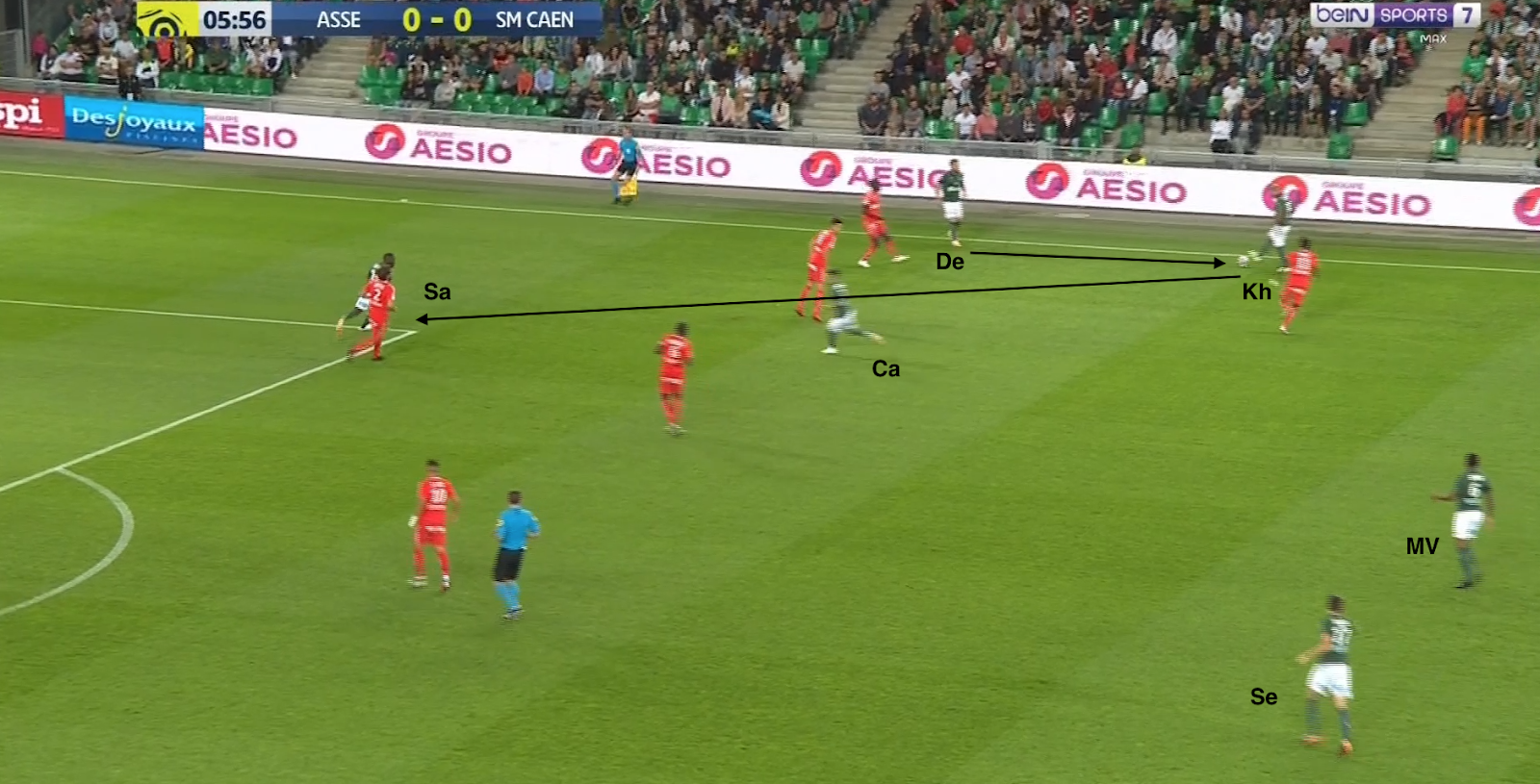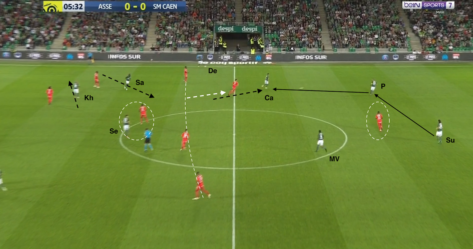 L'avant-centre adverse se laisse aspirer par le ballon, Cabella décroche encore plus, ce qui fait sortir un milieu caennais du bloc. Salibur décroche aussi dans cet espace et Khazri s'excentre à sa place. Comme M'Vila n'est plus surveillé...