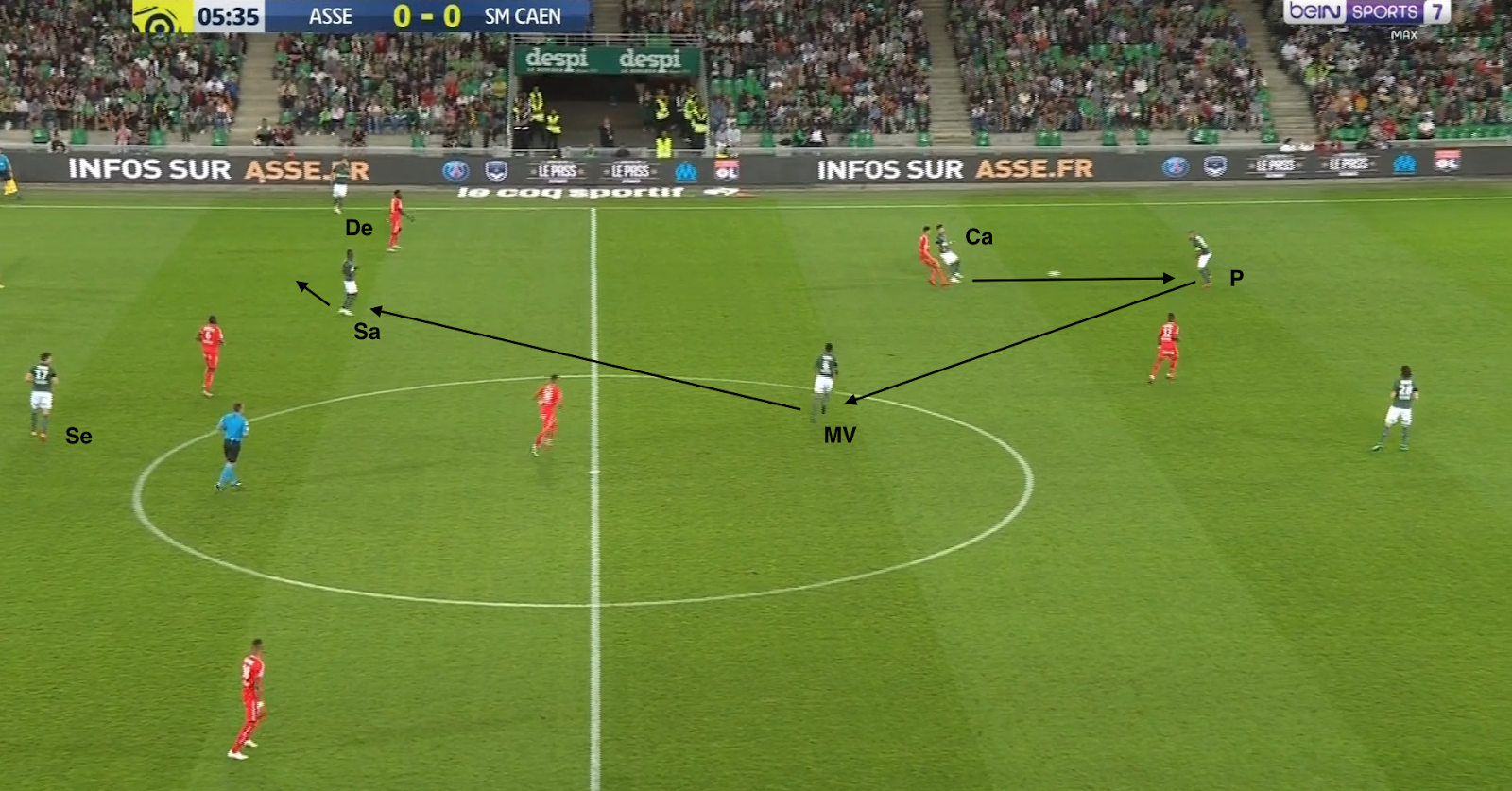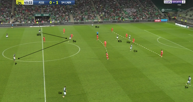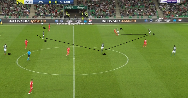 Les Caennais sont placés dans un 4-1-4-1, avec une sentinelle et un attaquant au marquage de Cabella et M'Vila, respectivement. Pendant que la défense stéphanoise garde le ballon, Cabella et Selnaes permutent :
