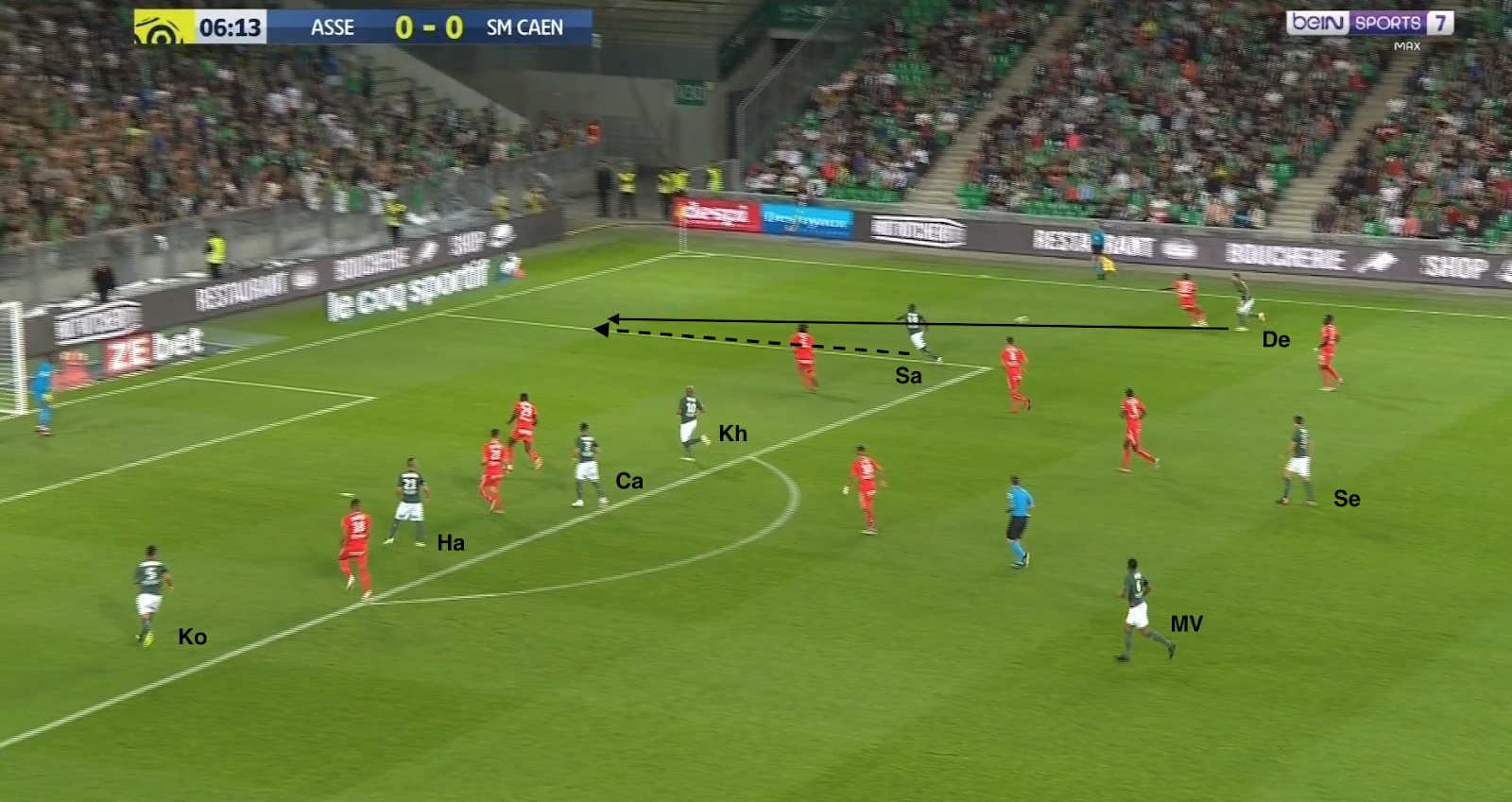 Le 4-2-3-1 de l'ASSE contre le 4-1-4-1 de Caen. Selnaes est trouvé dans l'axe et le dézonnage commence :