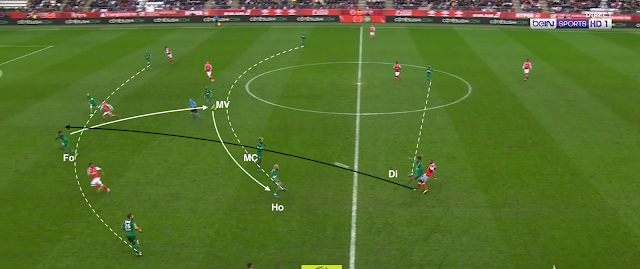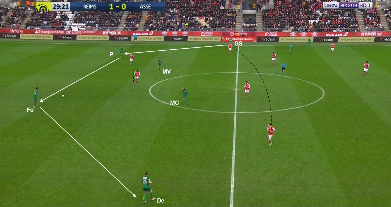 Le gardien joue avec un défenseur, qui avance balle au pied, sans être attaqué . Tous les Stéphanois sont à côté de leur adversaire direct dans cette partie du terrain, l'avant-centre adverse est même pris entre Fofana et Perrin. Sauf que le milieu de Camara s'excentre et le jeune axial ne le suit pas du tout. Il peut ainsi avancer balle au pied dans son couloir...