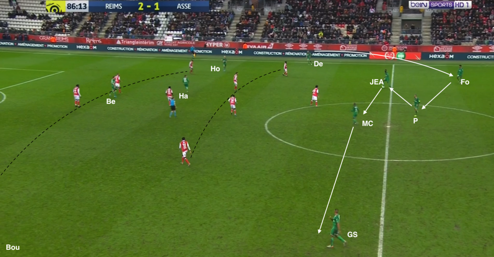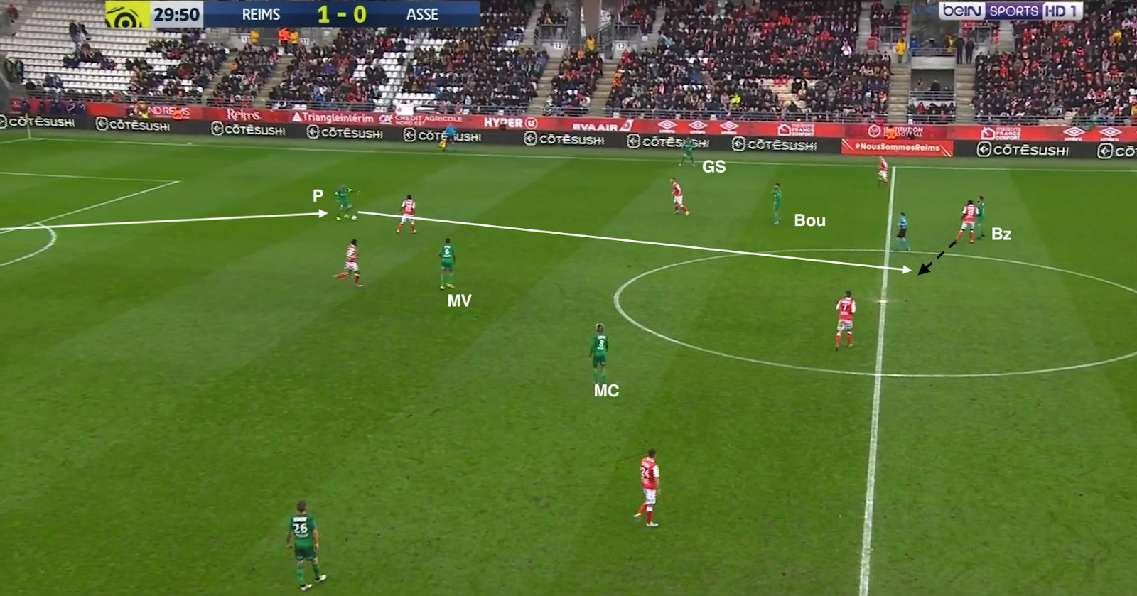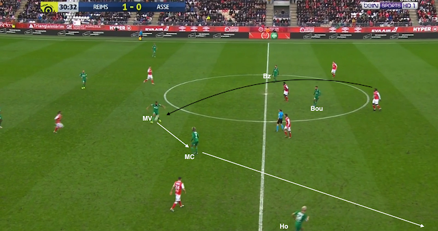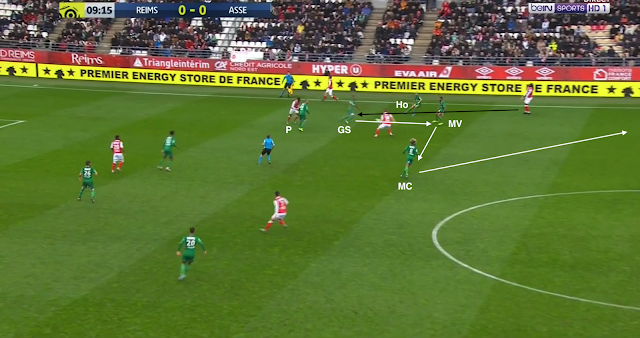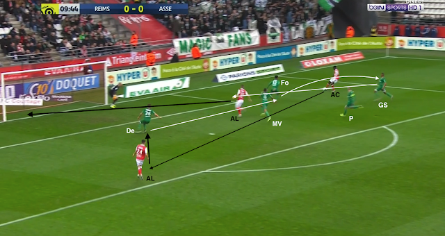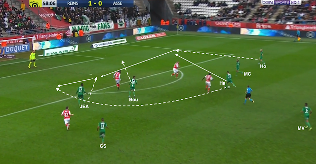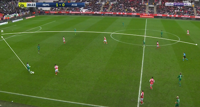 Bouanga est passé en pointe et le système est devenu un 4-1-4-1. C'est un système plus défensif, mais c'est surtout un système avec trois axiaux, ce qui a permis aux Verts d'avoir plus de présence au centre du terrain, d'avoir plus de solutions pour sortir le ballon proprement. Mais ce n'est pas sur une attaque construite qu'ils ont réussi à égaliser : lors de cette action, la possession est du côté du Stade de Reims, qui déplace le jeu vers la gauche. L'ailier et le latéral combinent dans le couloir, mais sous la pression de Honorat, le premier change de côté :