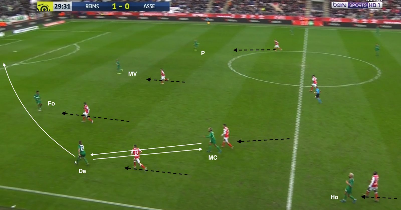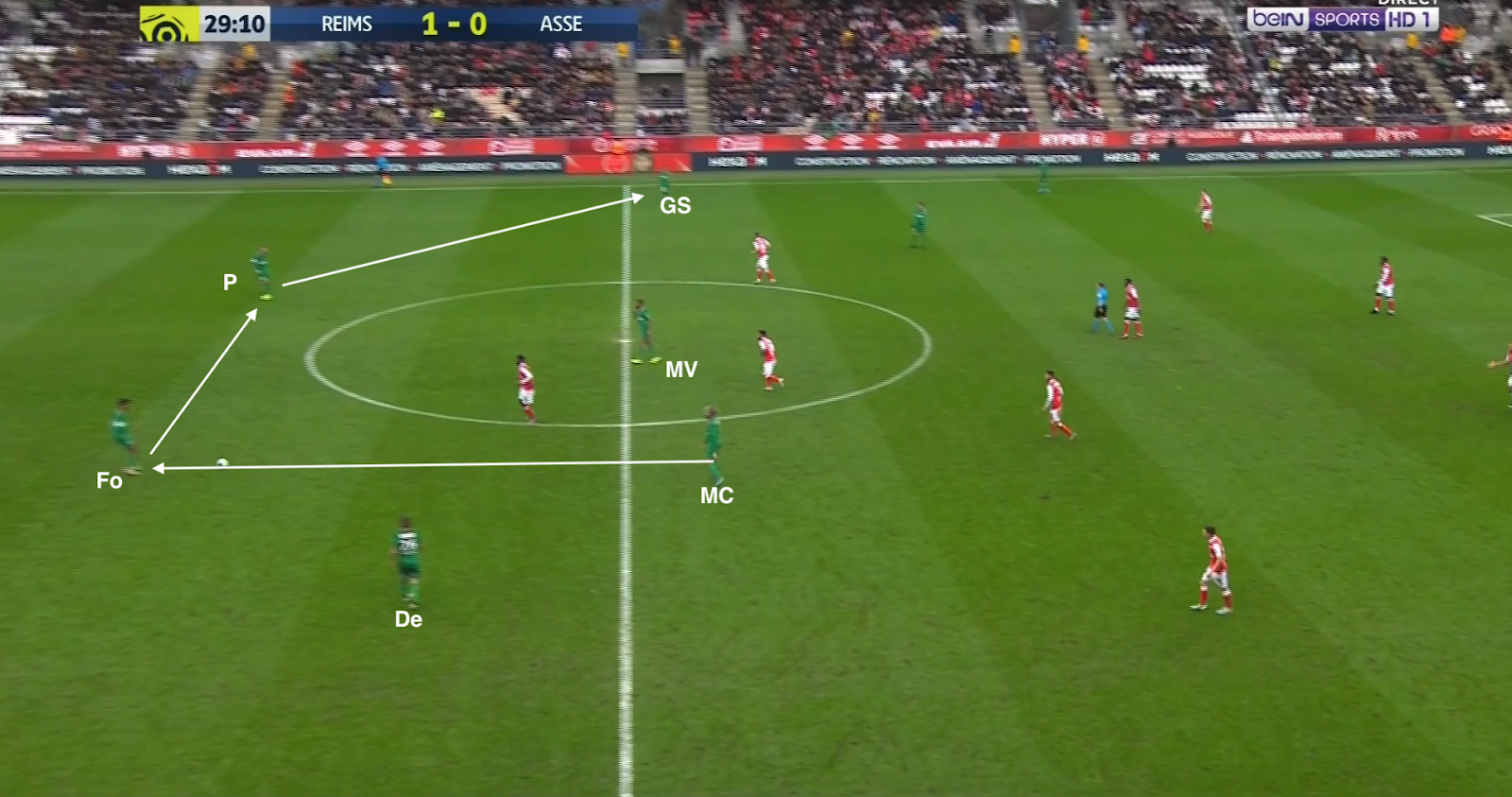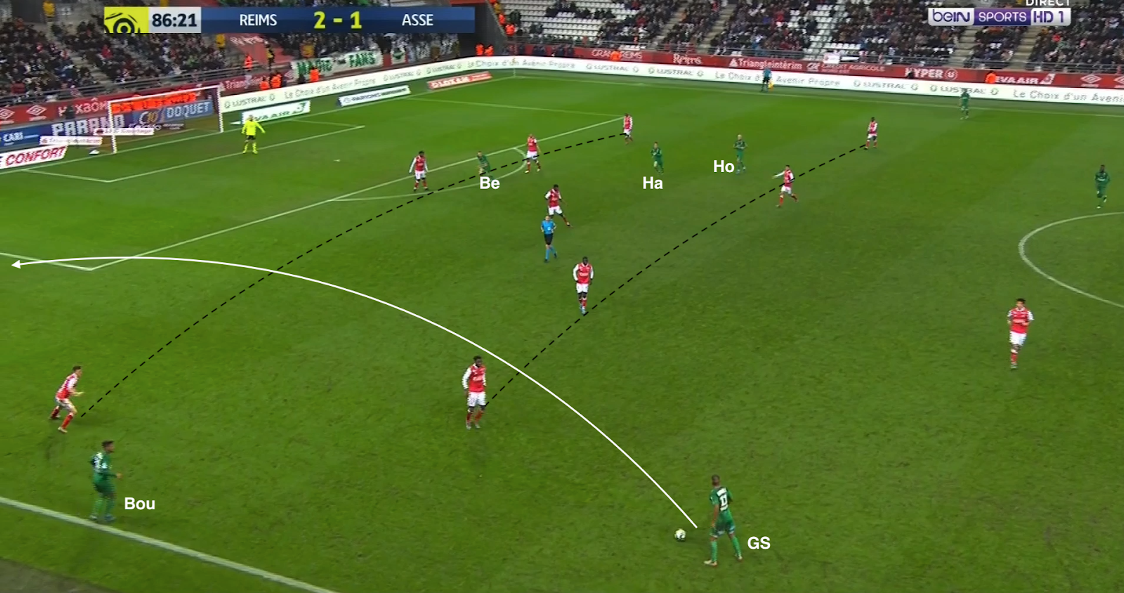 Bouanga est passé en pointe et le système est devenu un 4-1-4-1. C'est un système plus défensif, mais c'est surtout un système avec trois axiaux, ce qui a permis aux Verts d'avoir plus de présence au centre du terrain, d'avoir plus de solutions pour sortir le ballon proprement. Mais ce n'est pas sur une attaque construite qu'ils ont réussi à égaliser : lors de cette action, la possession est du côté du Stade de Reims, qui déplace le jeu vers la gauche. L'ailier et le latéral combinent dans le couloir, mais sous la pression de Honorat, le premier change de côté :