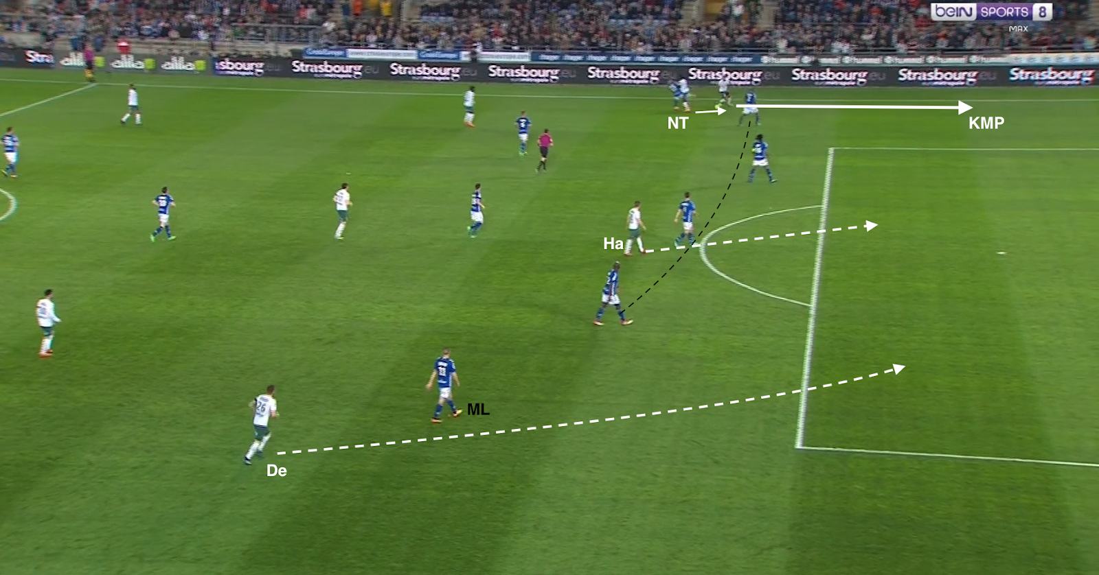 Il ne passe pas par M'Vila, mais écarte directement avec KMP, qui joue en première intention avec Ntep et lui propose ensuite une solution dans son dos. Le changement de côté est rapide, le jeu à une touche de balle aussi, mais la défense n'est pas en déséquilibre pour autant :