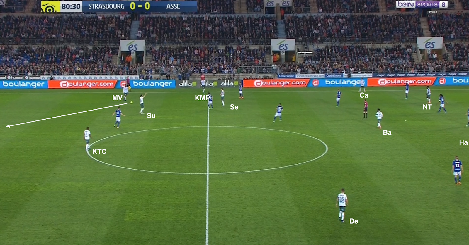... et les Stéphanois font tourner le ballon dans la défense, tranquilles - Strasbourg n'effectuant pas de pressing haut à ce moment du match. KTC, Subotic, M'Vila... le ballon est envoyé au latéral gauche KMP :