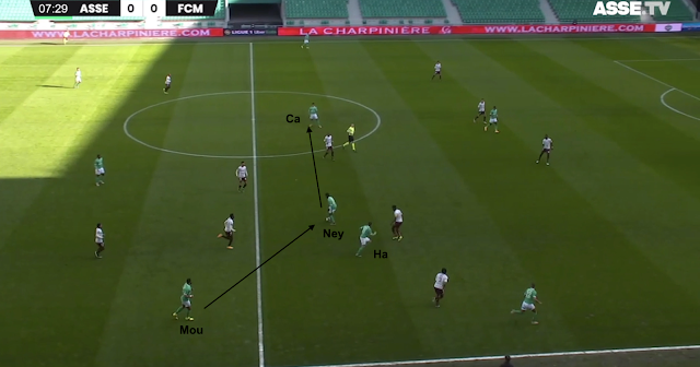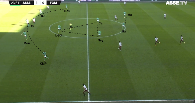 Les Verts ont passé le premier rideau et sont sortis de leur camp. Moukoudi joue avec Neyou, qui relaye jusqu'à Camara. Le bloc adverse se reforme dans sa propre moitié et les Stéphanois profitent du deuxième point faible identifié : les offensifs ne couvrent pas bien à leur gauche.