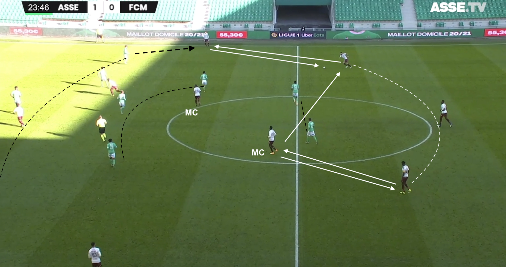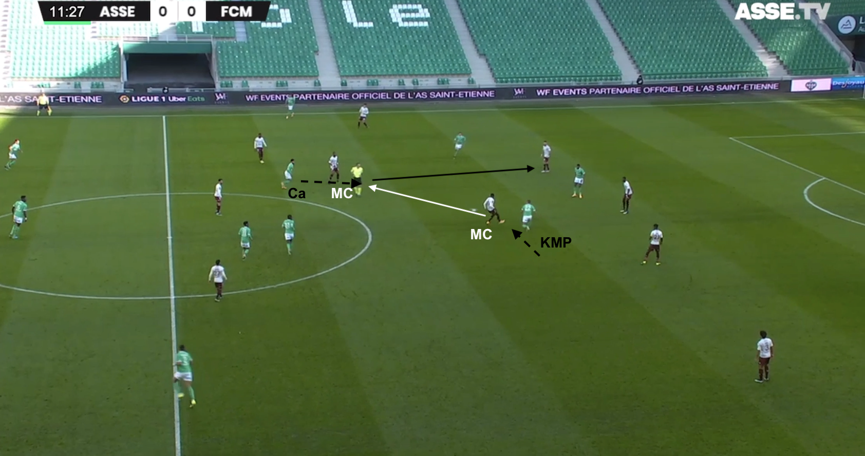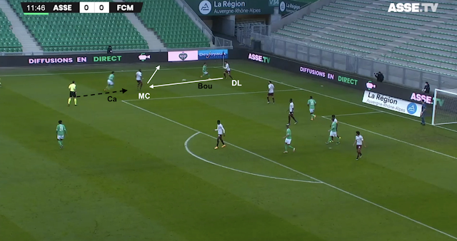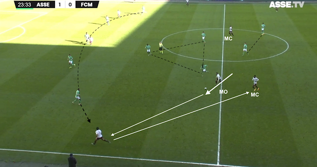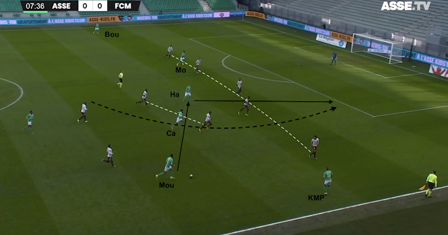 Le 5-3-2 stéphanois est en place, le milieu offensif de Metz doit décrocher pour toucher le ballon. Il cherche son piston gauche, mais KMP tient le couloir. Le jeu est donc envoyé à l'opposé...