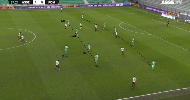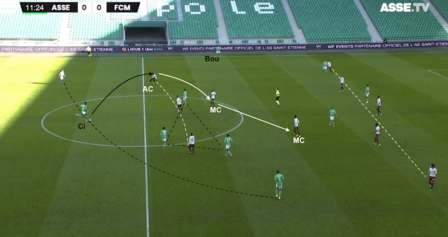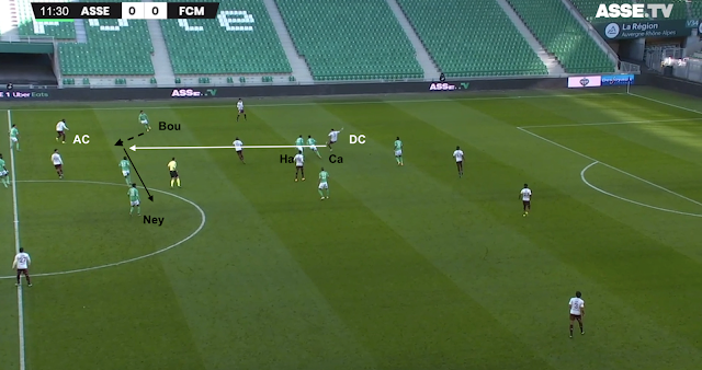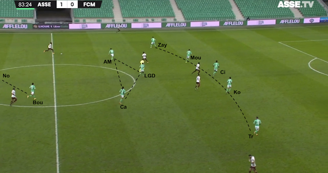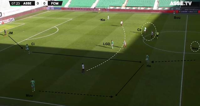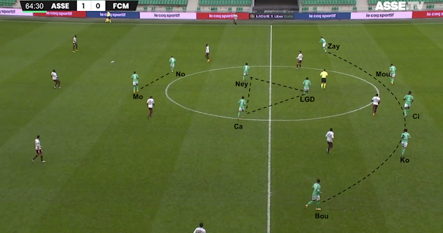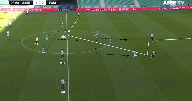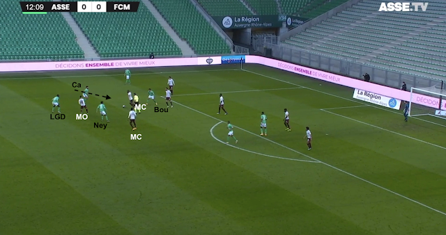 Si ce système était fait pour empêcher les Messins de développer leur jeu, l'animation offensive stéphanoise s'est appuyée sur les points faibles du système adverse. Des points faibles déjà identifiés avant le match et bien visibles dans cet exemple à la 8e minute :