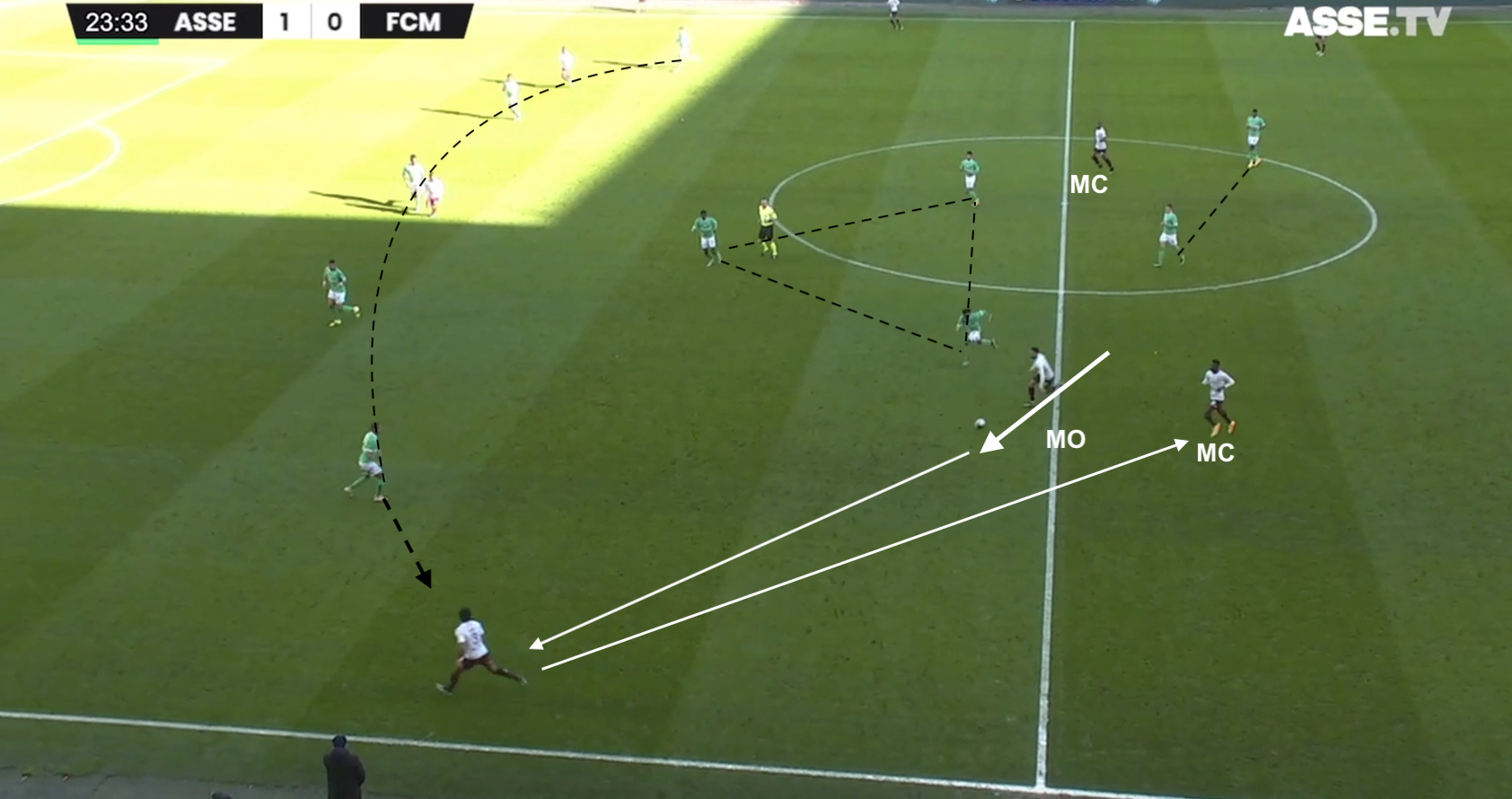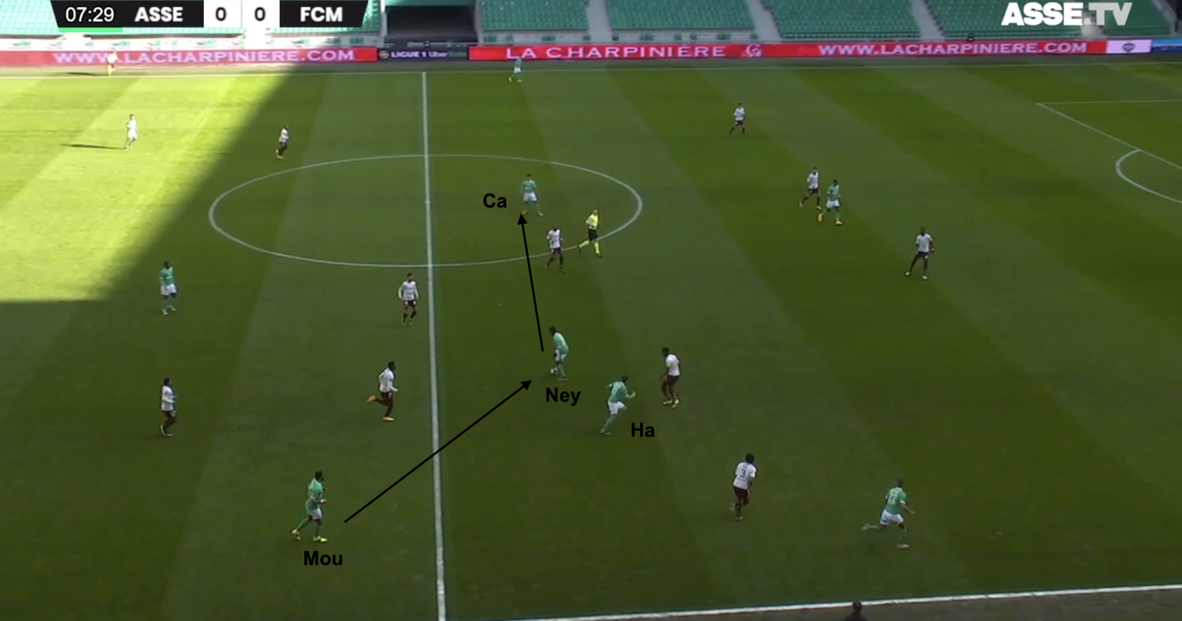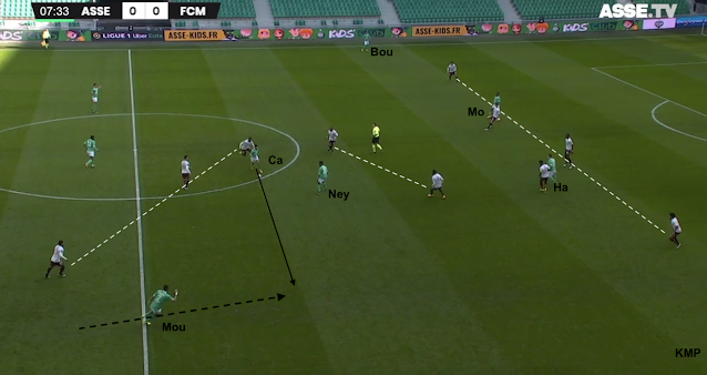 Les Verts construisent en partant de Moulin, avec Cissé. Le premier rideau adverse, de 3, est en place et les 2 milieux messins sont au marquage de Camara et Neyou (seulement le premier visible sur cette image). Premier point faible identifié : un attaquant qui décroche a beaucoup d'espace entre les lignes. Hamouma est donc facilement trouvé par Cissé et il écarte à droite avec Moukoudi.
