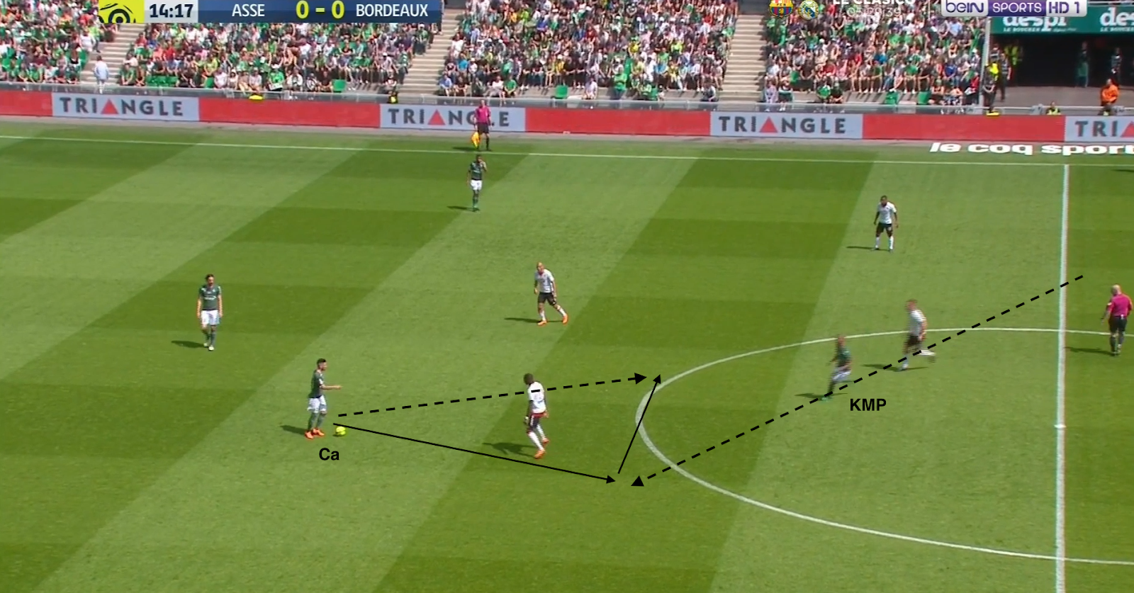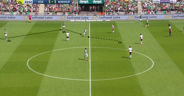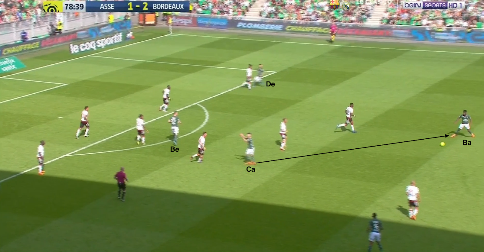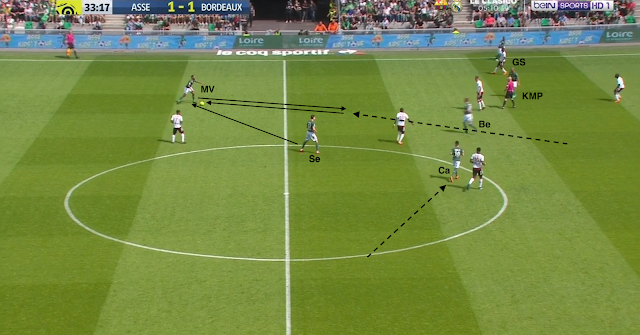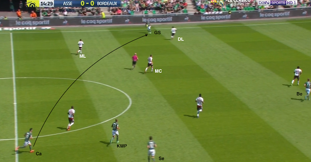 Perrin se trouve dans une position de meneur de jeu (et Cabella de défenseur central). L'adversaire qui se trouve à terre n'a pas d'influence sur cette action, il y a trois stéphanois autour de lui (M'Vila, Cabella et Subotic). Il y a des 2-contre-2 dans chaque couloir, Beric est entouré de 3 adversaires... il n'y a aucun décalage fait, sauf que l'appel de Bamba est parfaitement effectué dans l'espace libéré par le latéral adverse, tout comme la passe du capitaine, qui le trouve à l'entrée de la surface. Malheureusement sa frappe trouve le poteau...