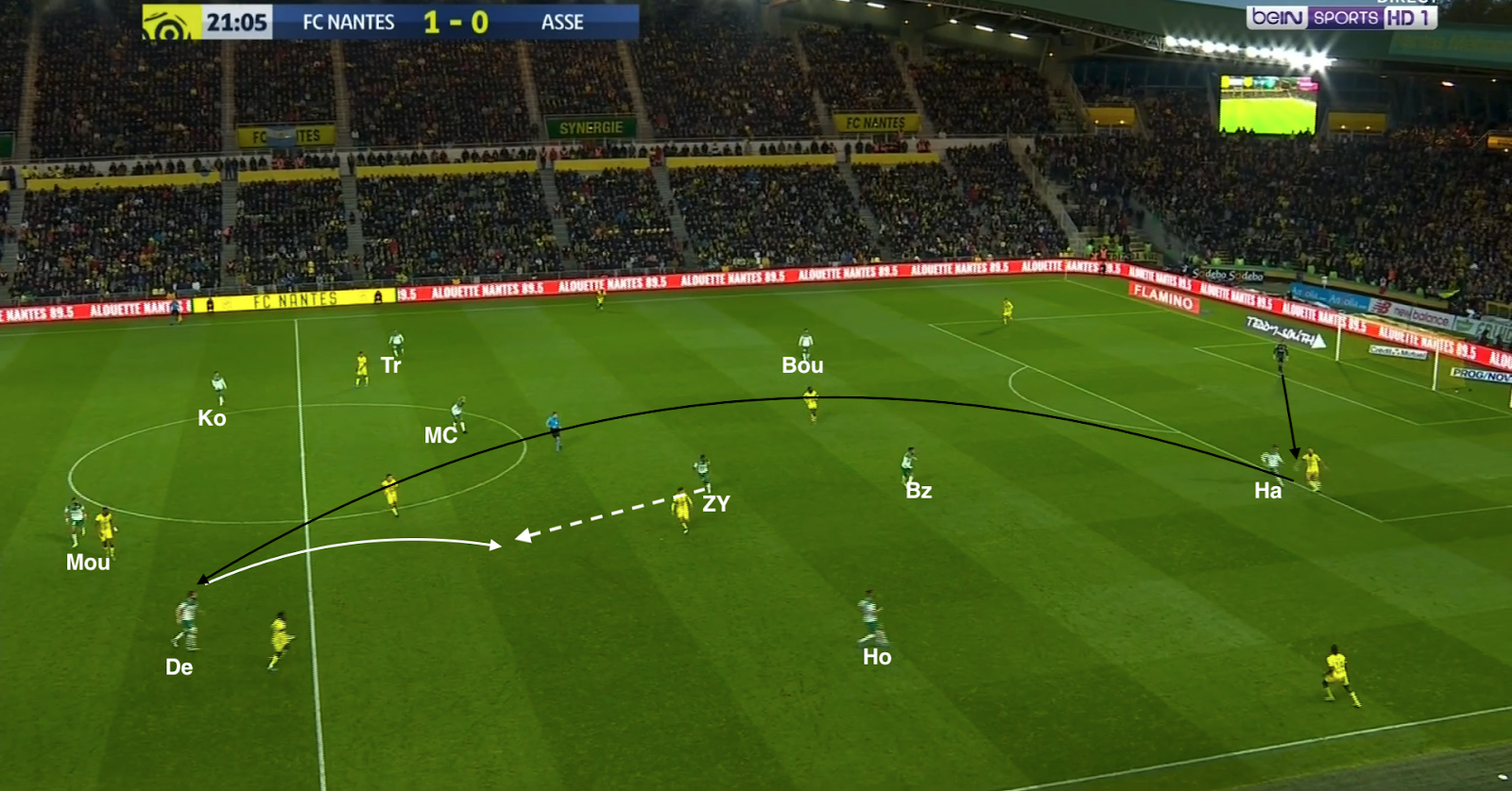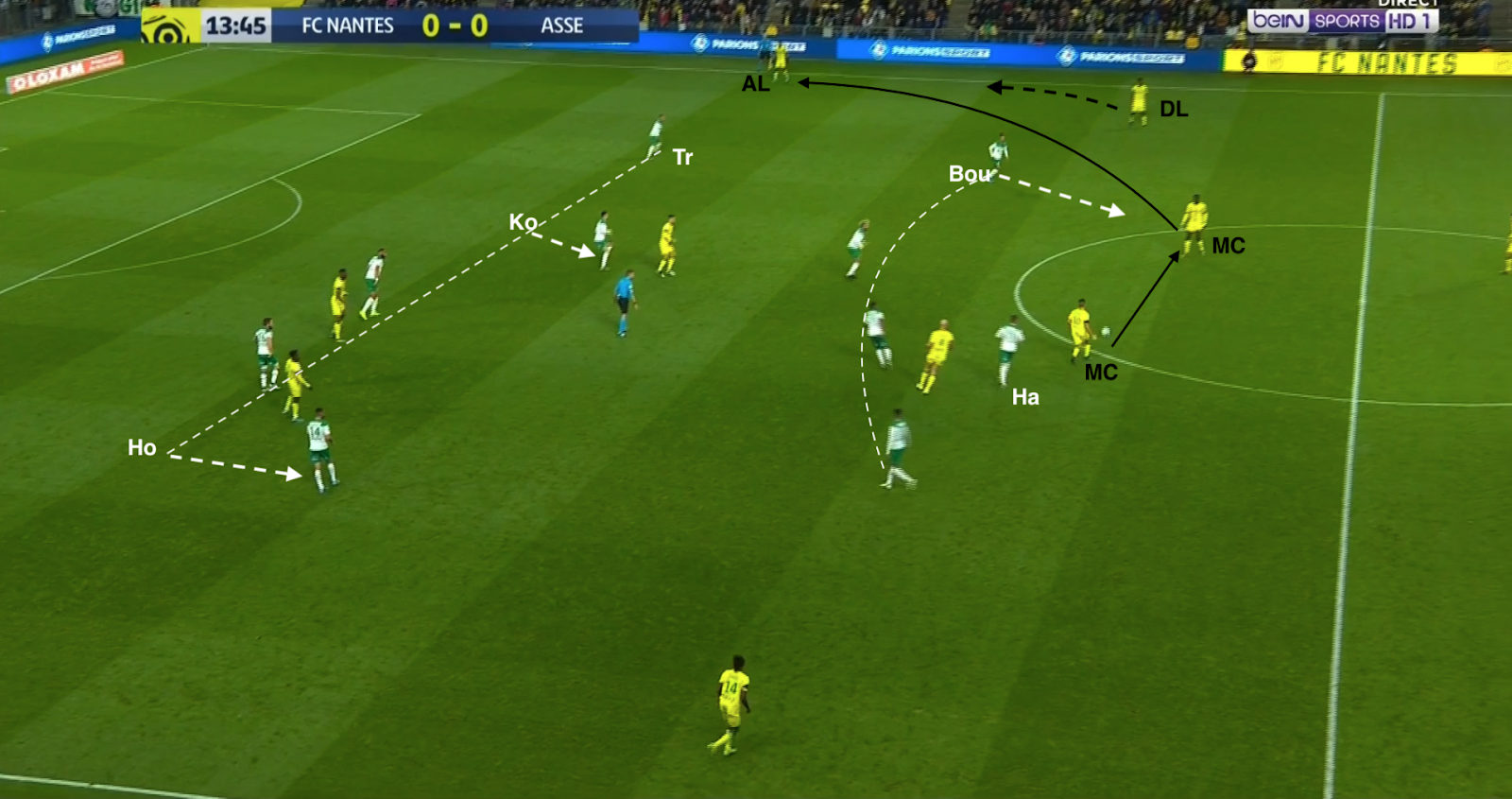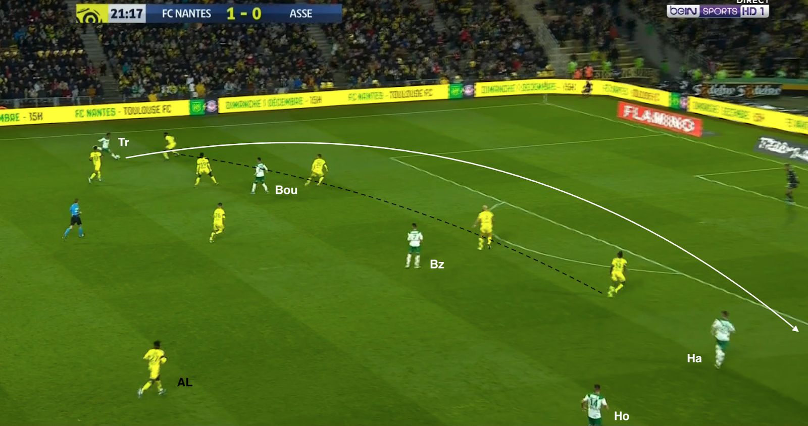 Du côté gauche, Bouanga a été bien plus souvent au marquage de son latéral, mais pas toujours, comme dans cet exemple peu avant au quart d'heure de jeu, qui commence avec une touche nantaise :