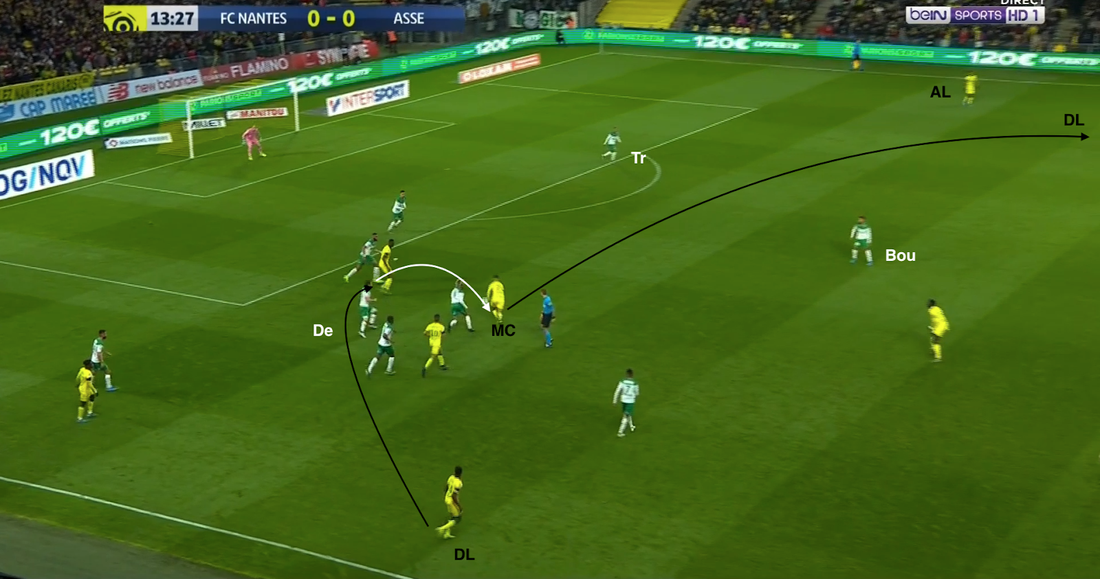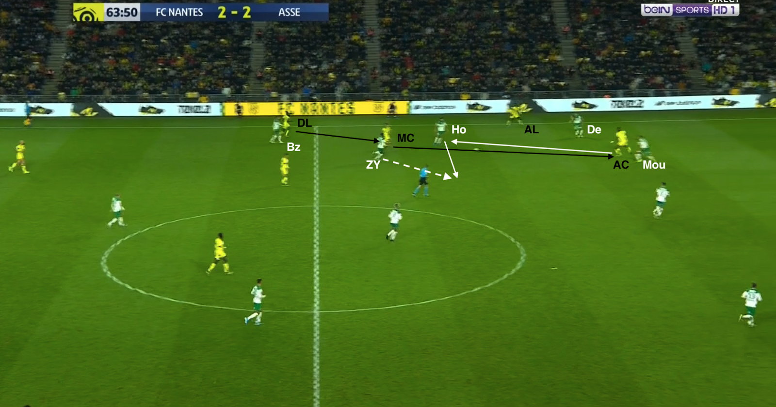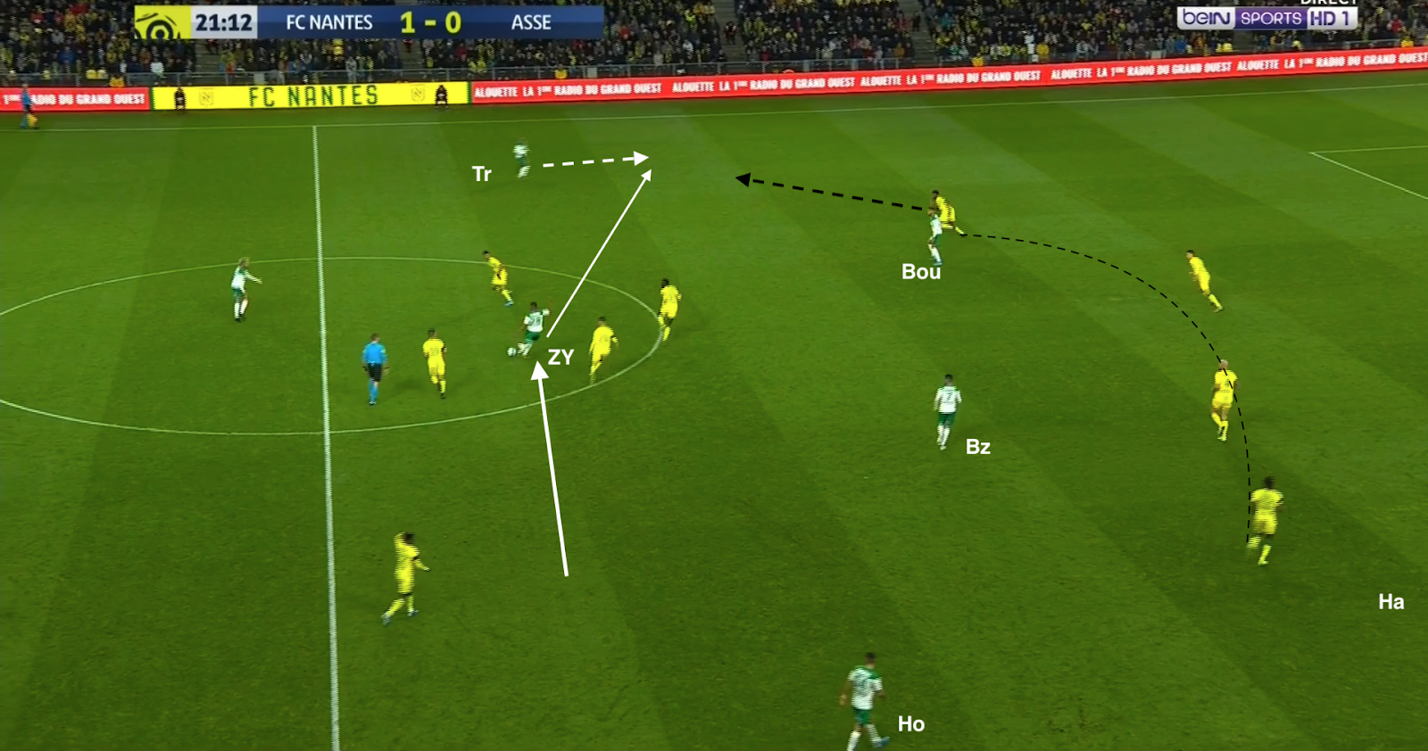Du côté gauche, Bouanga a été bien plus souvent au marquage de son latéral, mais pas toujours, comme dans cet exemple peu avant au quart d'heure de jeu, qui commence avec une touche nantaise :